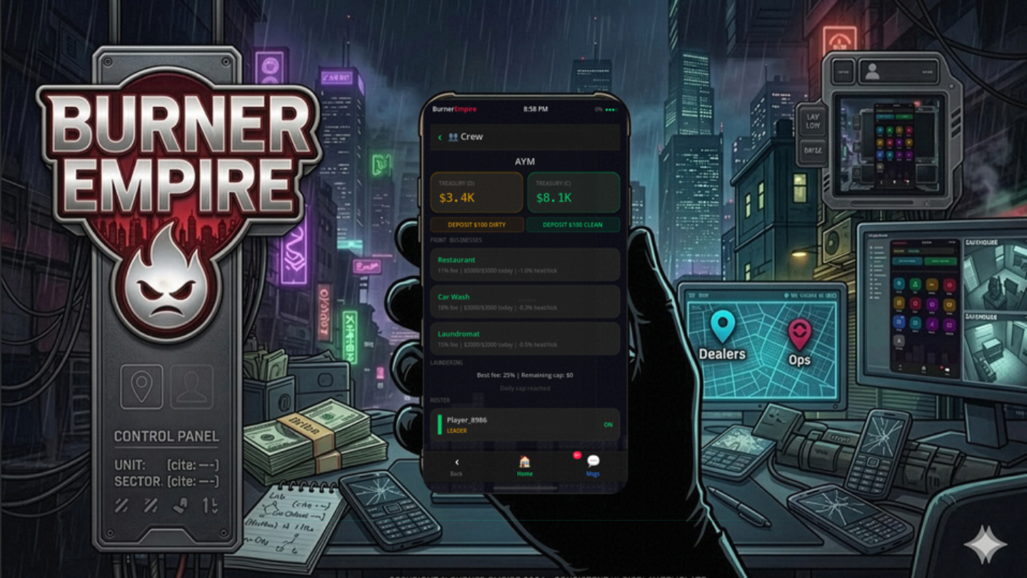 «Burner Empire is fully playable with a complete gameplay loop. Players can cook and sell five drug types across eight unique districts, recruit dealer networks that earn while offline, engage in real-time PvP standoffs with gear-based combat, form crews with shared treasuries and front businesses, and launder their way up through eight progression ranks — from Street Rat to Cartel Boss.
