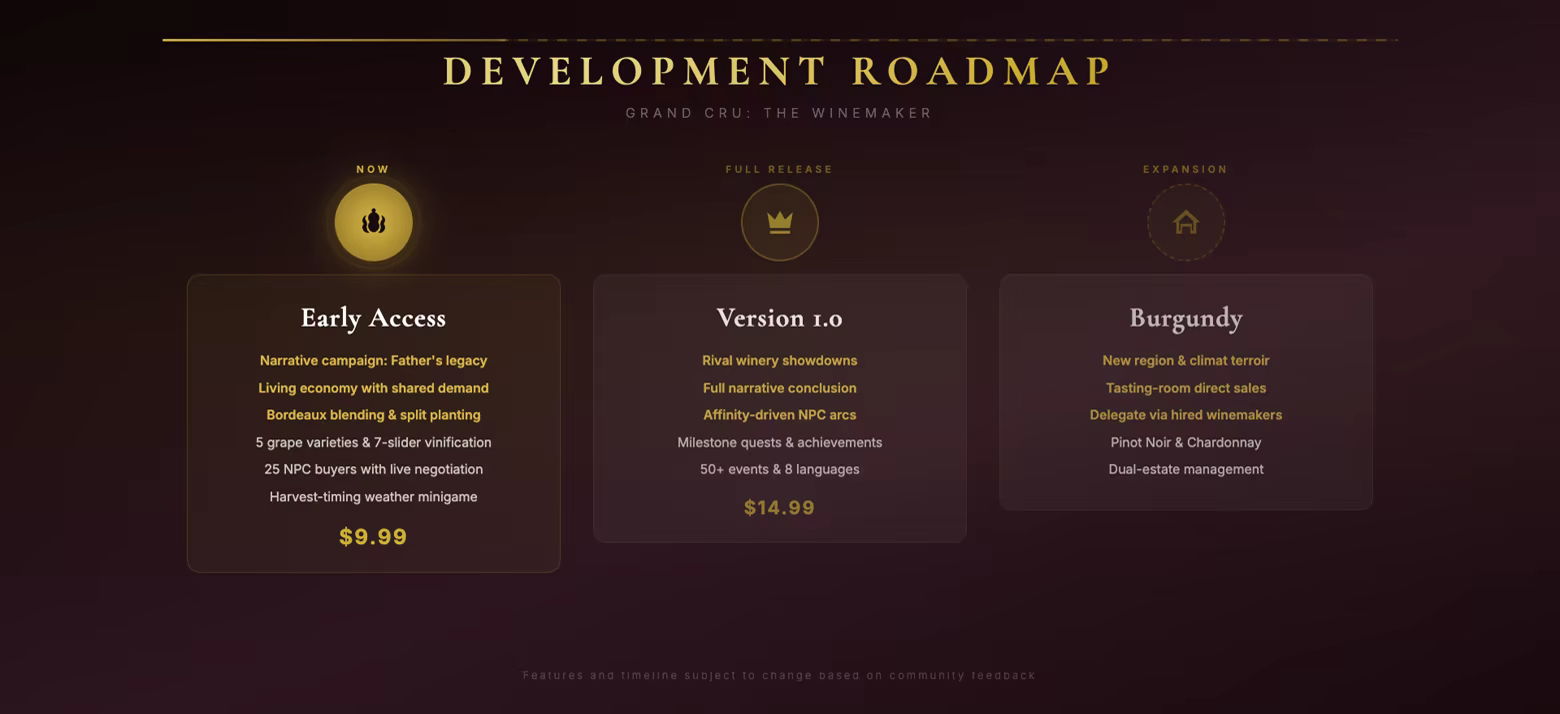 “Grand Cru is a complex management simulation. We want to balance the delicate relationship between terroir data, economic variables, and player decision-making through community feedback to ensure a truly vintage experience”