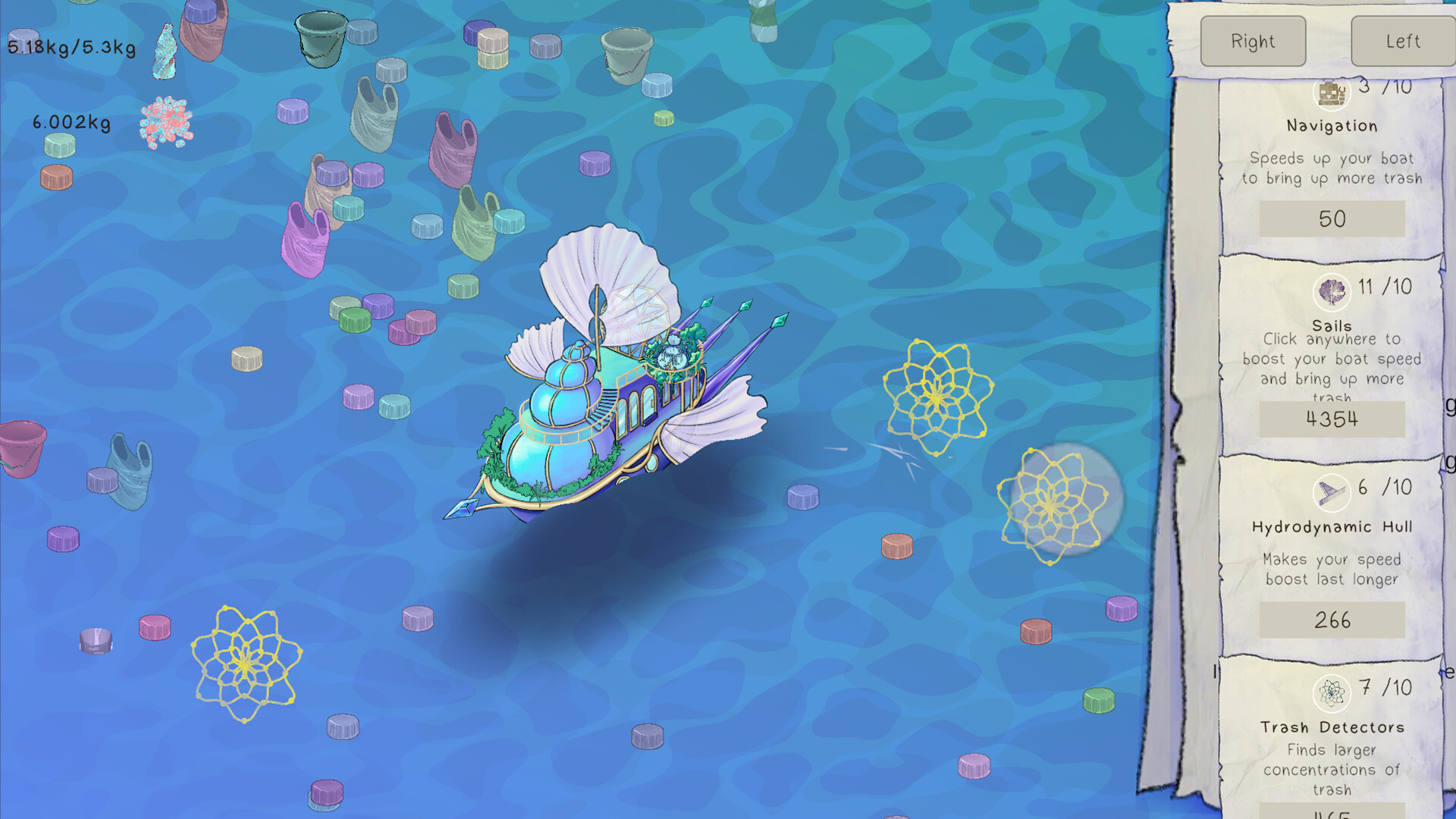 Ocean Cleaner Idle is a solarpunk game where you can use your mouse to pick up trash from the ocean and recycle it into materials to improve your ship. Clicking will trim your sails to move faster and bring more trash for your collectors. Or you can let your crew do their job and let the game idle and collect the trash for you.