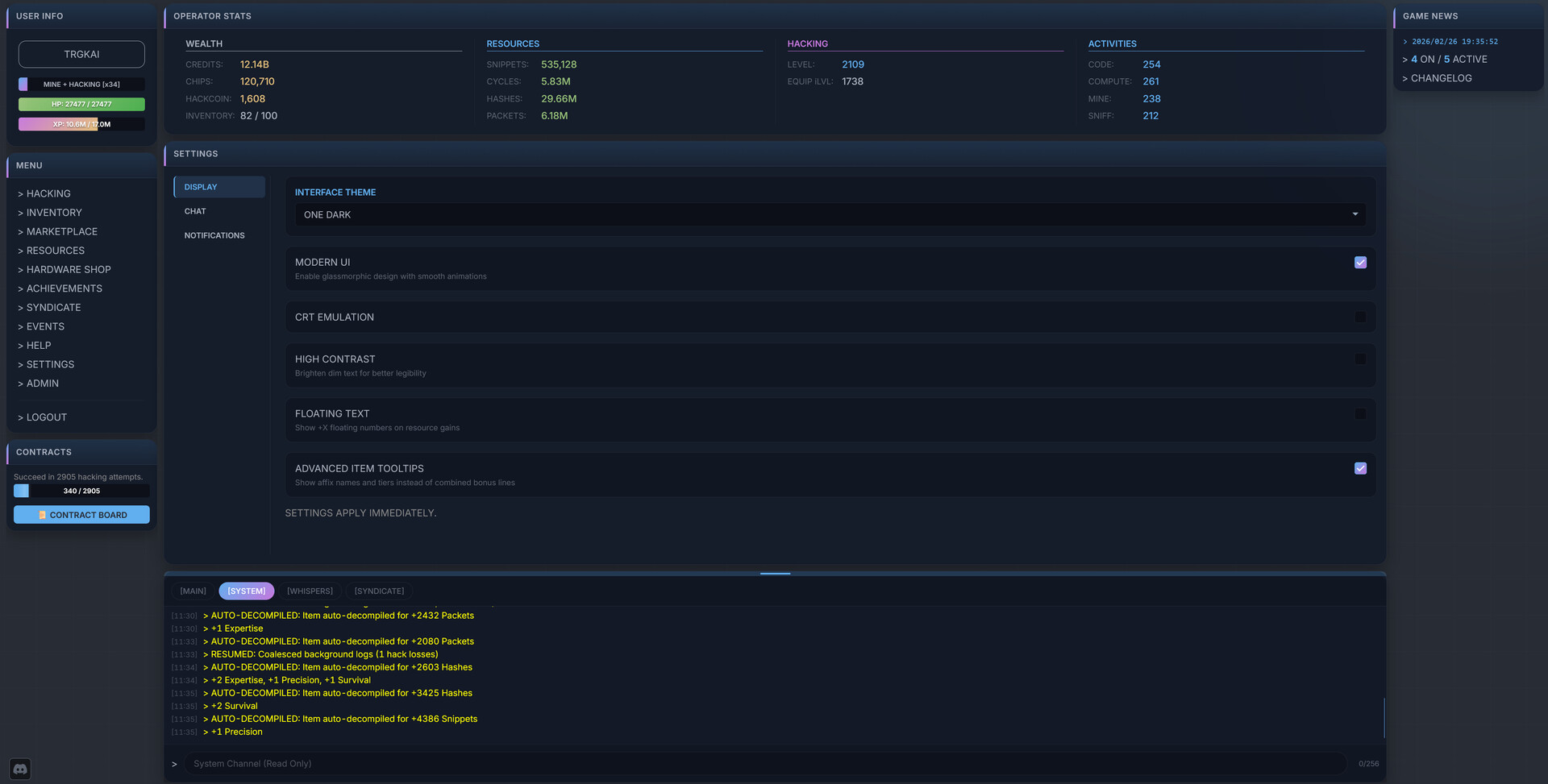 A persistent idle MMORPG, with a text-based hacking theme. Enjoy the "Inaction RPG" design philosophy by crafting equpiment using ARPG influenced prefix/suffix systems, build or join player managed syndicates, trade on the marketplace, and compete in community events.
