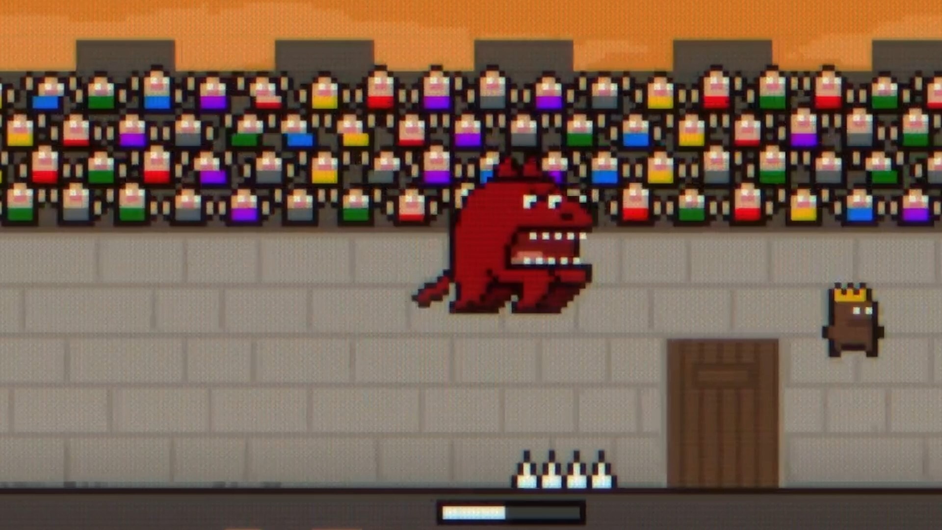 Jump, double jump, stomp, and survive as enemies pour through doors and the stage shifts around you.