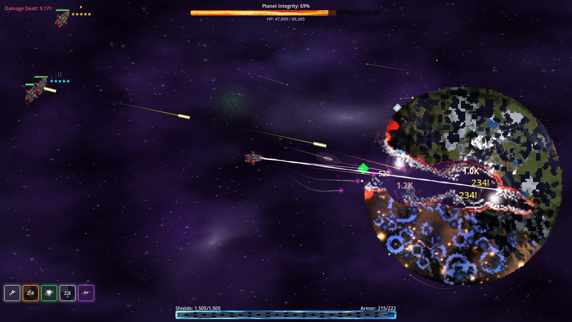 A physics-driven sci-fi destruction roguelite. Orbit hostile worlds, unleash devastating weapons, and carve real craters into fully simulated planets while escalating planetary defenses fight back.