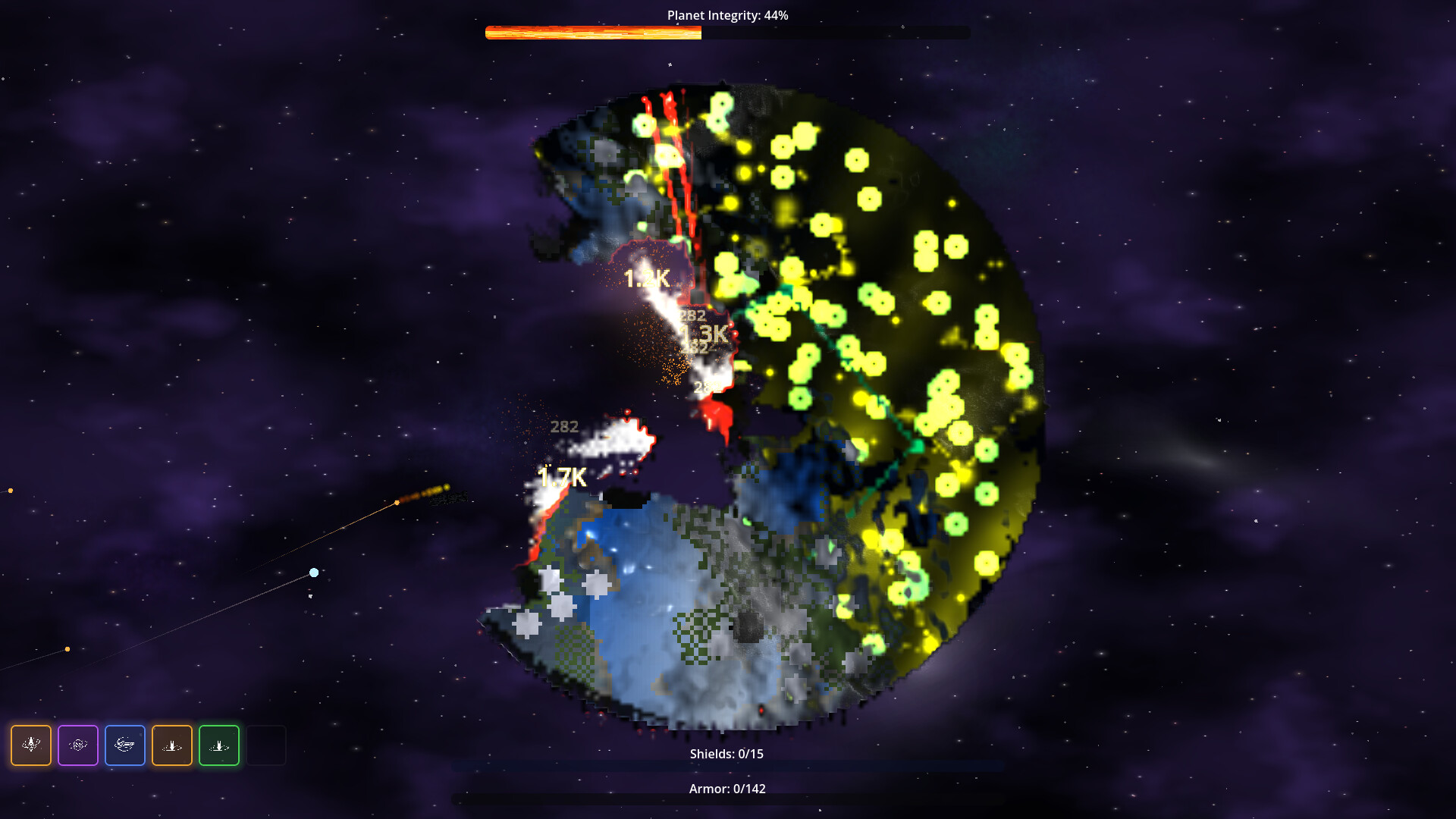 A physics-driven sci-fi destruction roguelite. Orbit hostile worlds, unleash devastating weapons, and carve real craters into fully simulated planets while escalating planetary defenses fight back.