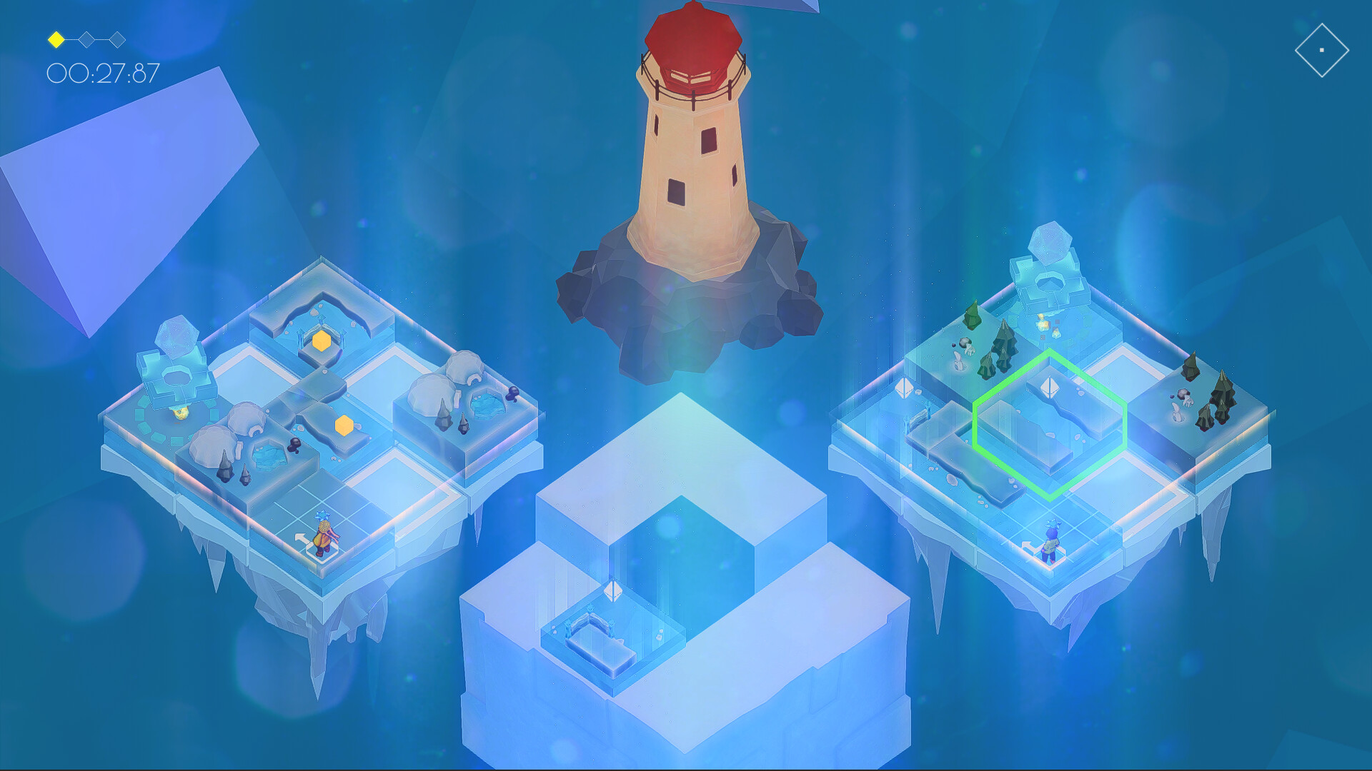 Mirrored duality puzzles across icy terrain and snow-covered paths. Introduces slippery ice movement and momentum-based navigation.