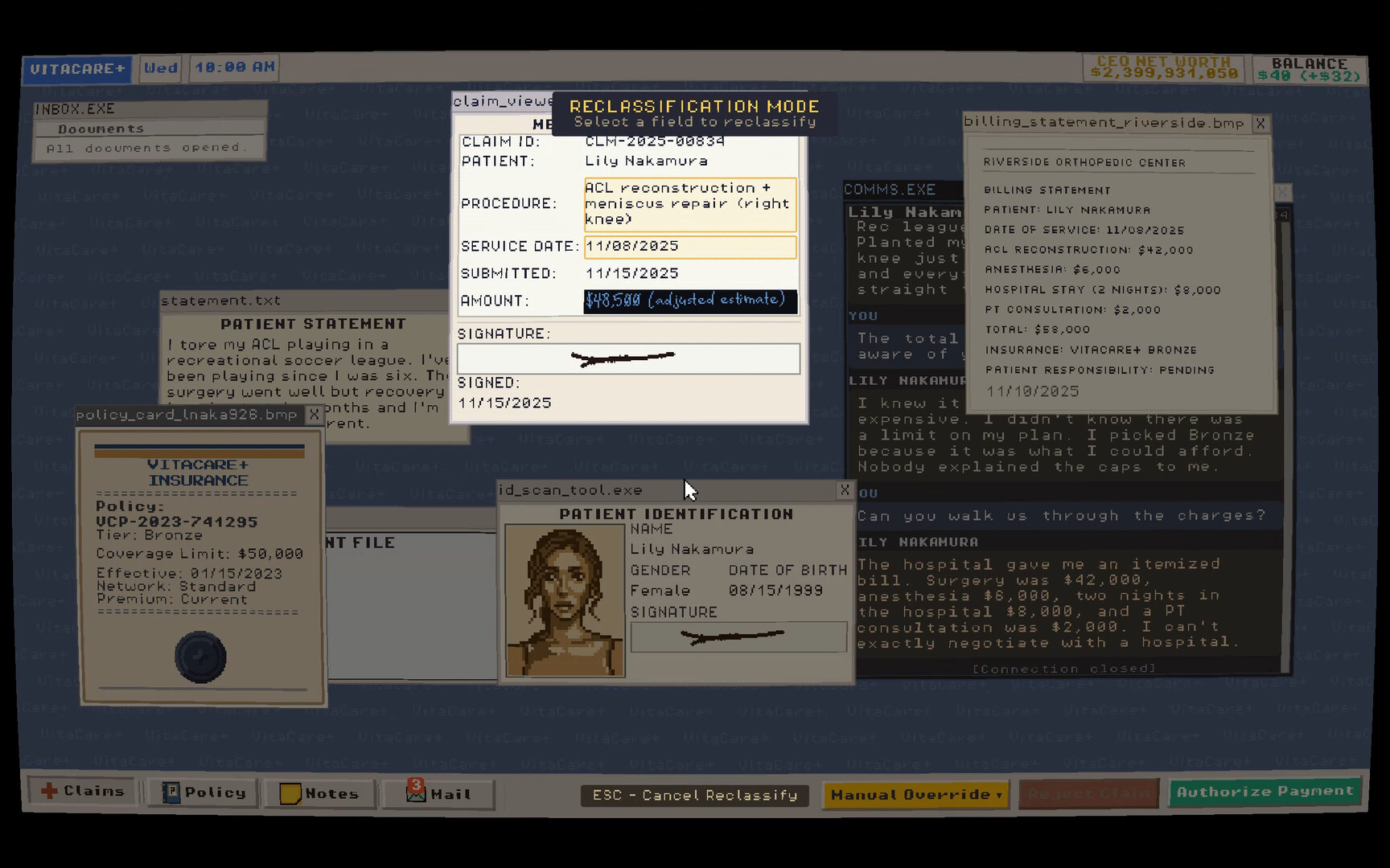 • Time Pressure: A daily timer governs your shift. Claims left unprocessed when the clock runs out are claims you don't get paid for. Your rent, your family's wellbeing, and your own VitaCare+ premiums depend on how many you clear before the day ends.