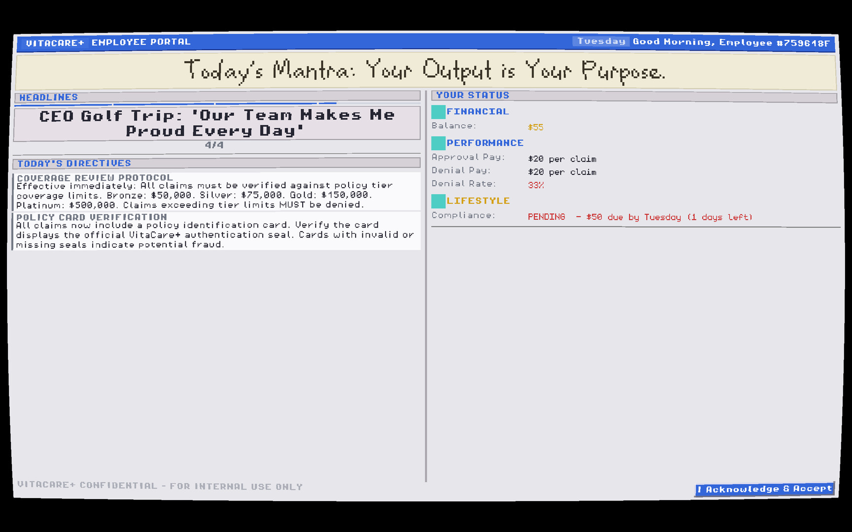 • Time Pressure: A daily timer governs your shift. Claims left unprocessed when the clock runs out are claims you don't get paid for. Your rent, your family's wellbeing, and your own VitaCare+ premiums depend on how many you clear before the day ends.