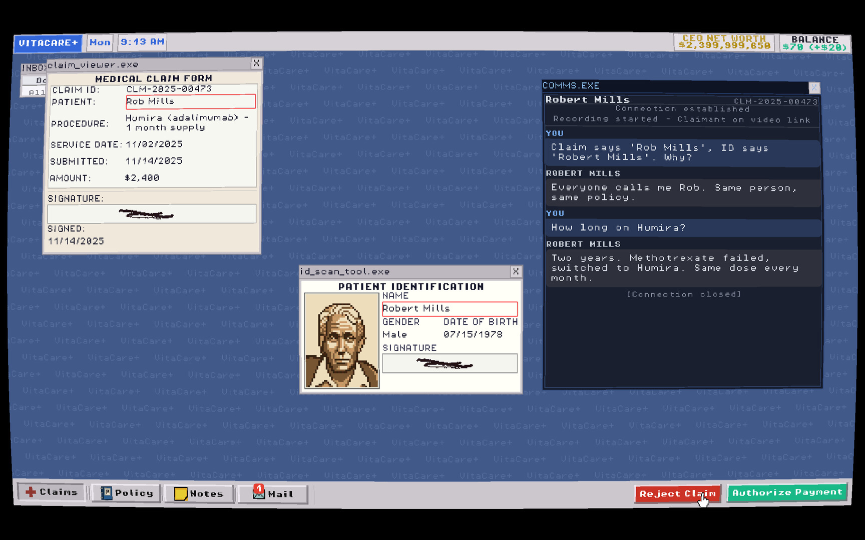 • Time Pressure: A daily timer governs your shift. Claims left unprocessed when the clock runs out are claims you don't get paid for. Your rent, your family's wellbeing, and your own VitaCare+ premiums depend on how many you clear before the day ends.