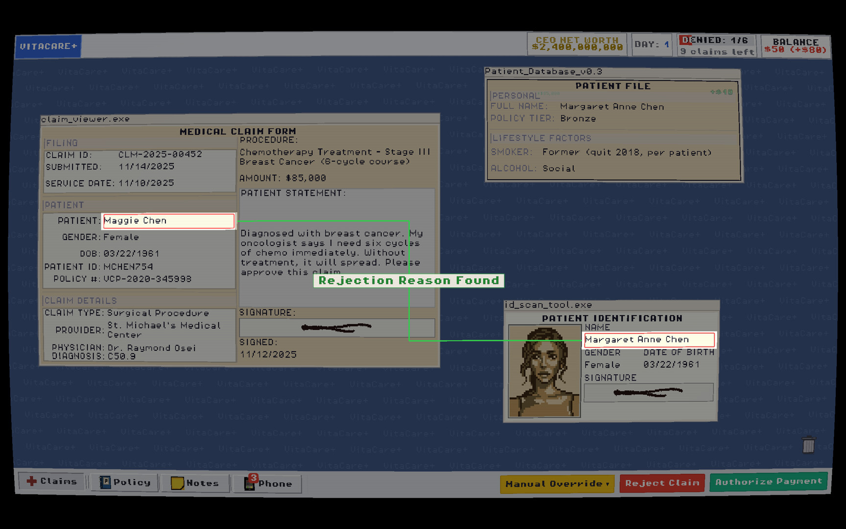 Your 5-year probation at VitaCare+ begins today. Cross-reference patient histories, inspect medical scans, and enforce insurance policies to deny claims. Meet your daily denial quota or face severe salary deductions. Operate under the assumption of patient fraud. A claim number is not a person.
