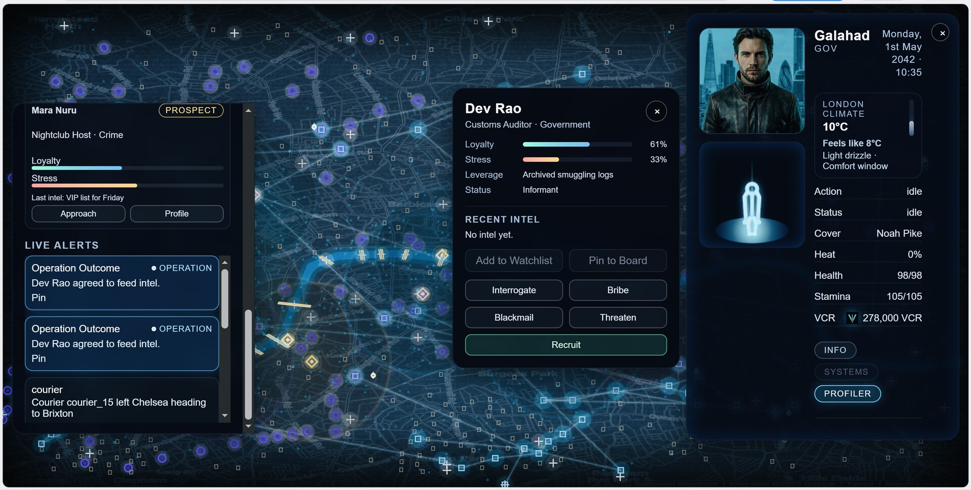 In VYRÜEL, you operate as a field agent inside a modern London shaped by competing political, corporate, criminal, media, and intelligence forces.