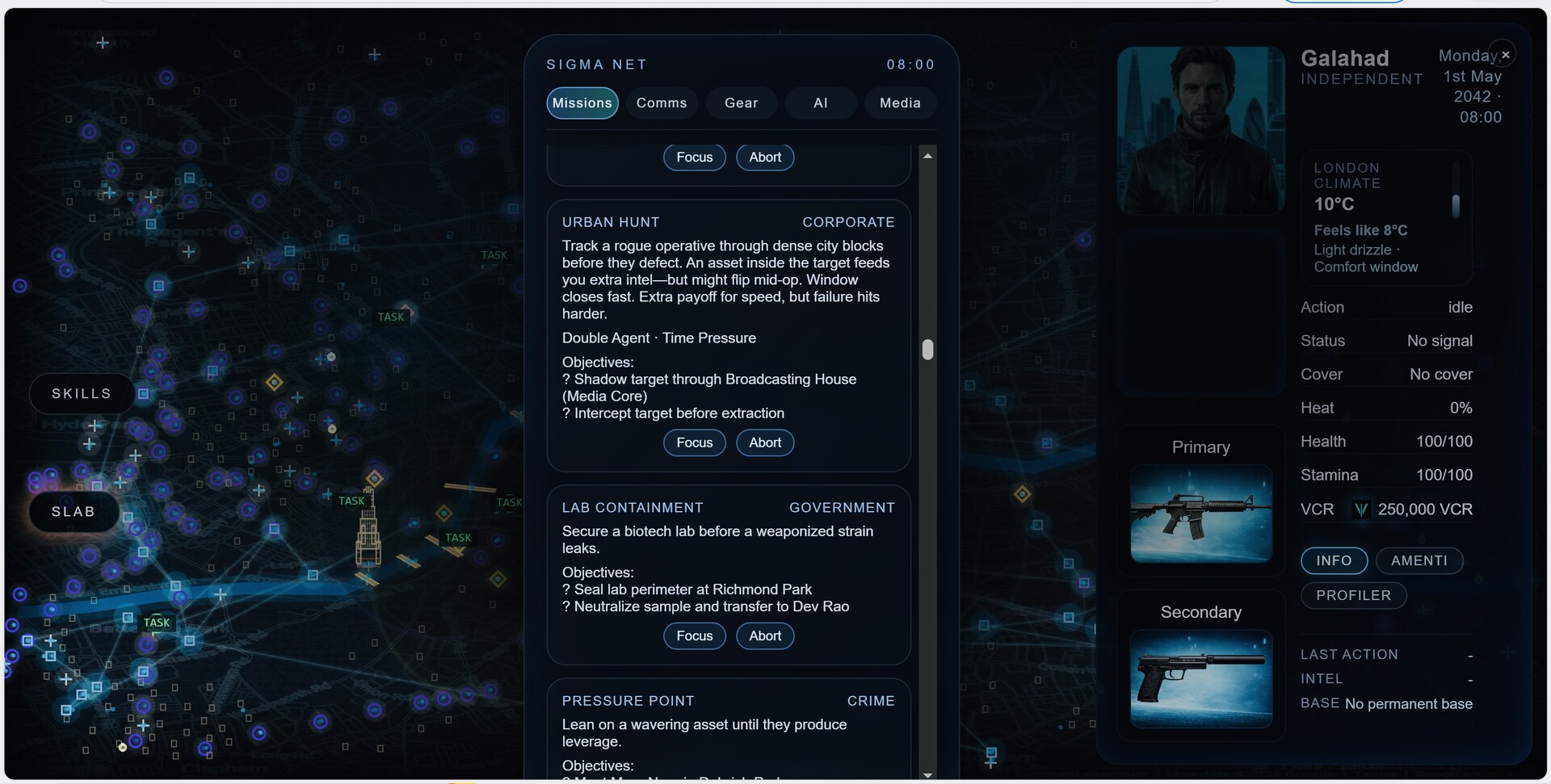 In VYRÜEL, you operate as a field agent inside a modern London shaped by competing political, corporate, criminal, media, and intelligence forces.