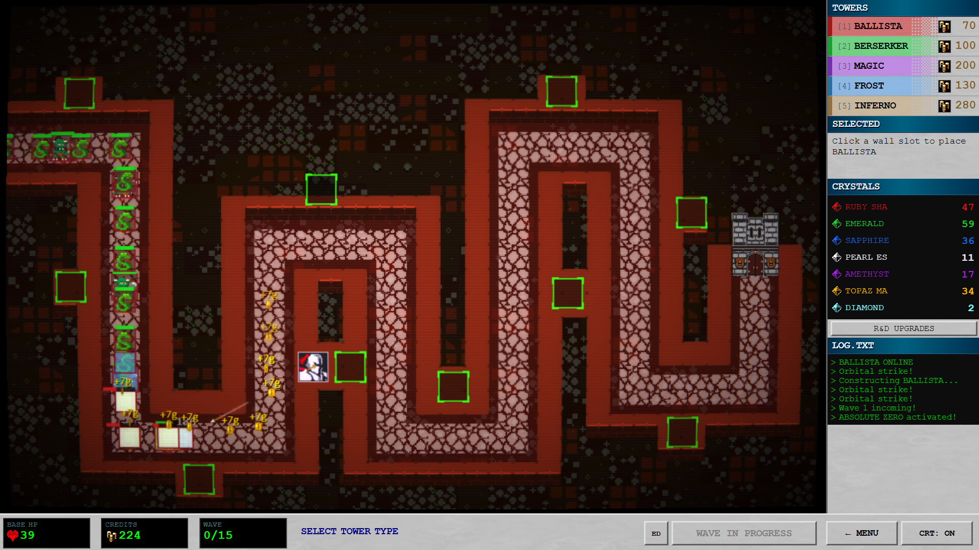 Place towers on a grid map, manage resources, and fend off waves of enemies. The game features a skill tree that upgrades different types of towers and unlocks new tactical possibilities. Crystals serve as upgrade points: they are earned by destroying enemies, but are only credited upon successful completion of a wave. The more powerful the upgrade, the rarer the crystals required to unlock it.