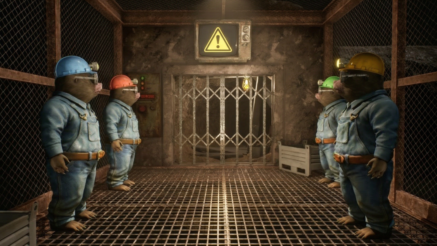 Only a limited number of players are authorized to enter the galleries at a time. The remaining teammates stay in the elevator, assisting from above through voice communication, coordinating decisions and guiding the team. Roles rotate between runs, and players can still split underground by descending into vertical shafts using ropes.