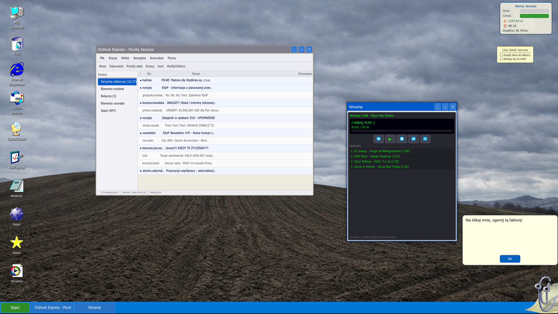 You are Janusz, a 47-year-old Polish business owner. Your mission: issue one e-invoice through KSeF before 5 PM. A Windows XP bureaucracy simulator with 15 apps, 30+ random interruptions, multiple endings, and disco polo.