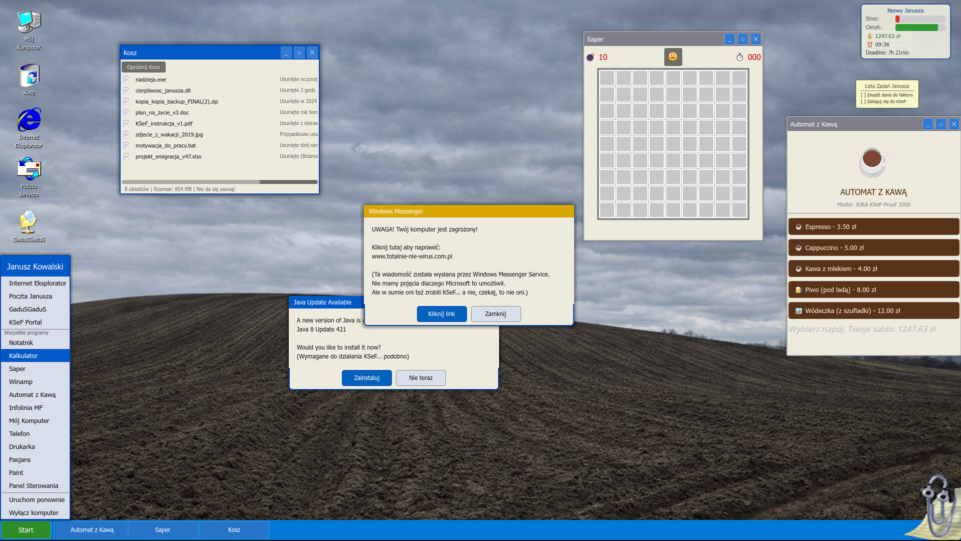 - **15 interactive apps** — KSeF invoice system, email client, GaduGadu messenger, Internet Explorer with 10 parody websites, Minesweeper, Solitaire, Notepad, Calculator, file browser, music player with disco polo tracks, coffee machine, phone, printer, helpline, and a trash can.