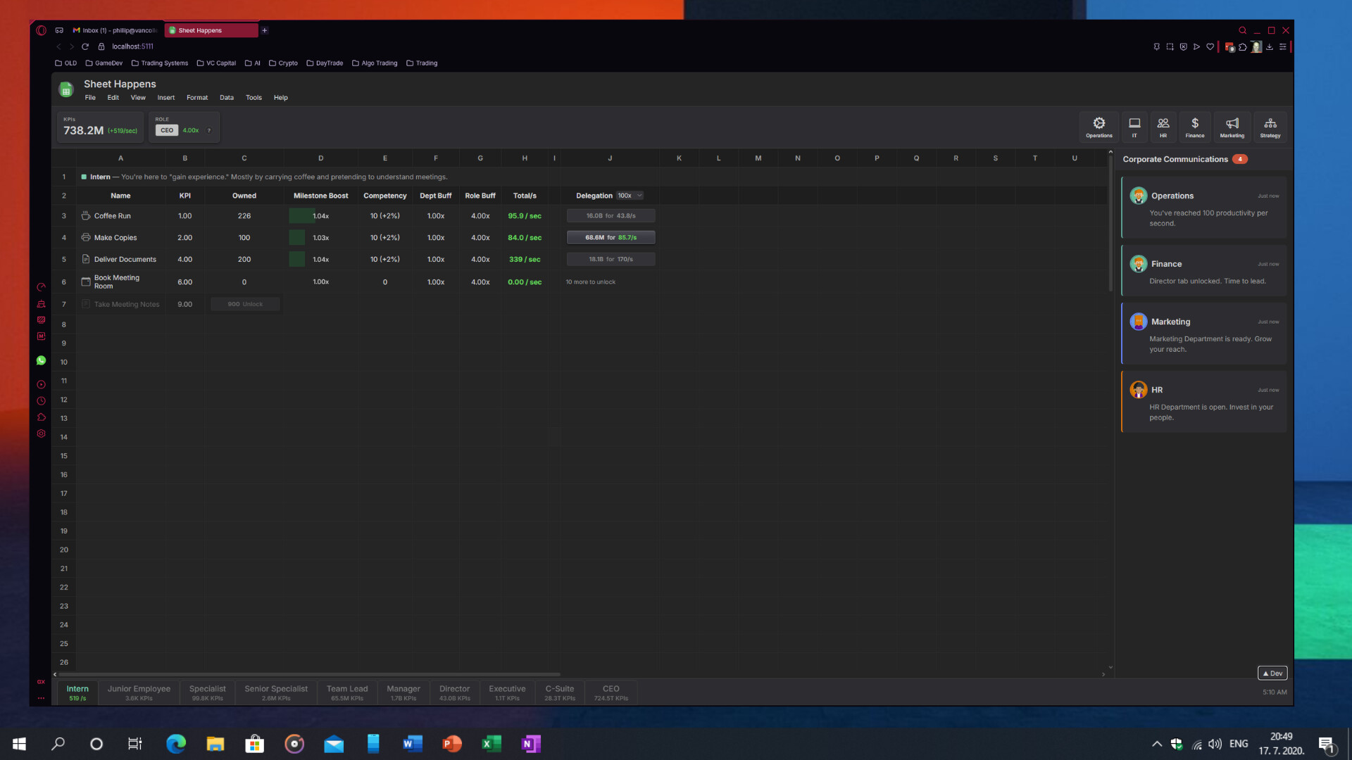 A corporate spreadsheet idle game where you climb the ladder from Intern to C-Suite by generating KPIs, automating busywork, and satisfying a Board that demands exponential results. Totally NOT a Game.