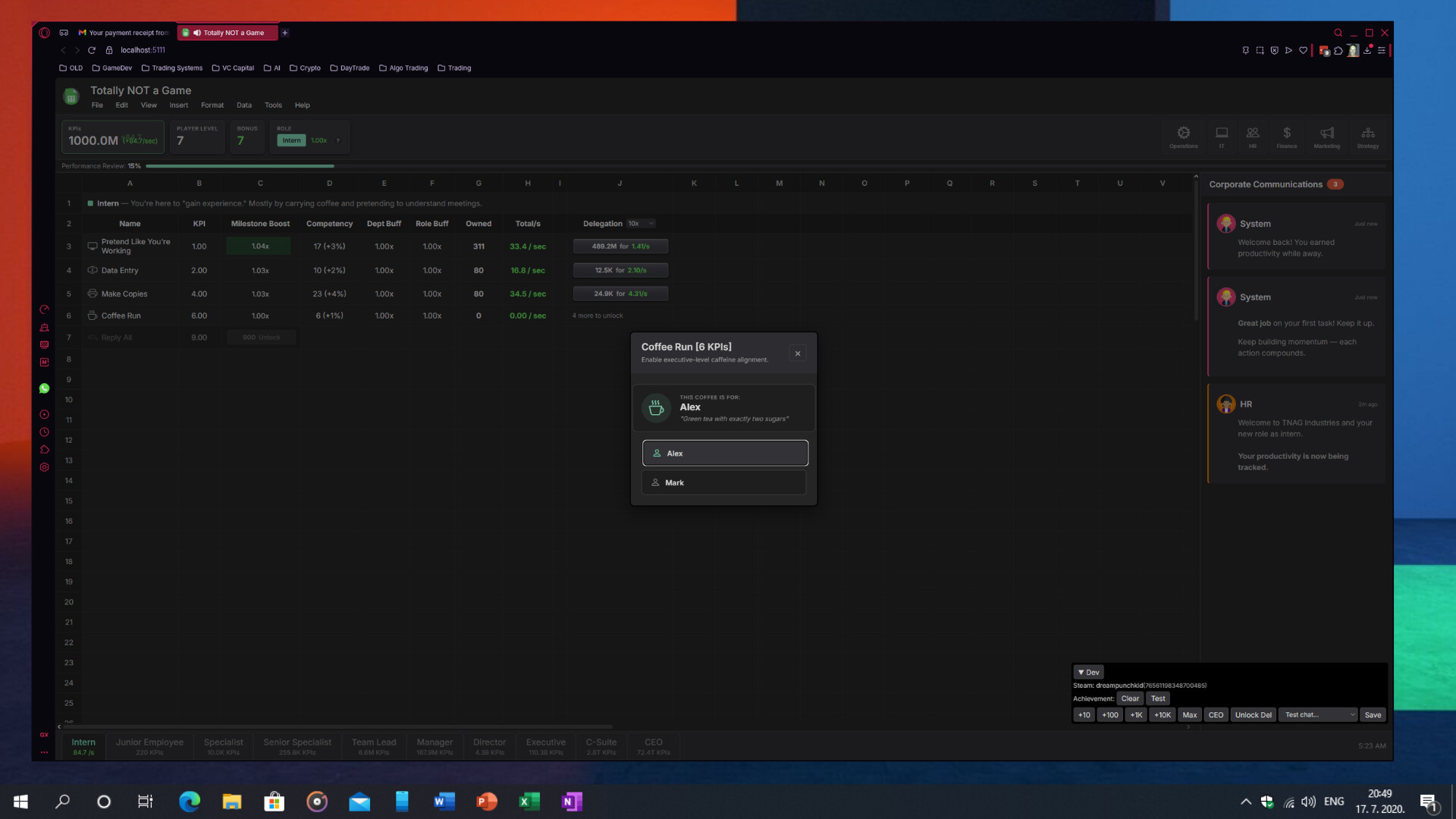 Totally NOT a Game is a corporate incremental / idle experience disguised as a spreadsheet. Start as an Intern performing simple office tasks and work your way up to the C-Suite by generating KPIs, unlocking automation, and surviving executive expectations.