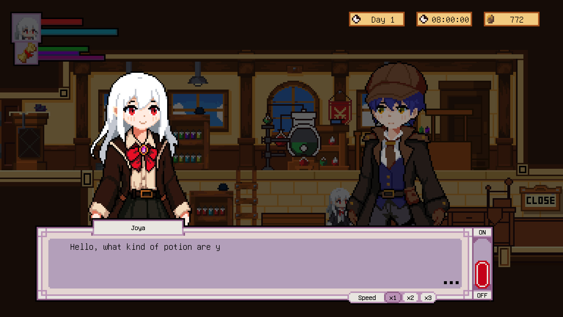 You'll open a potion shop in Sacred Heart City and learn about the reasons for the decline of Sacred Heart City by meeting a wide variety of customers. This is a story-based business simulation game, the main gameplay is that the customer asks you to make the right potion according to the request.