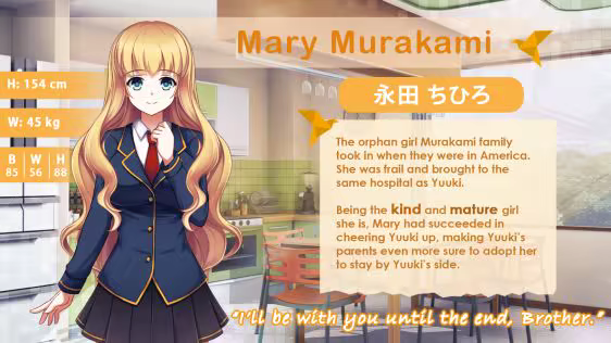 "One Last Crane" is a visual novel centered on Yuuki Murakami, a boy who has a brain tumor. After a long year of treatment without any positive results, Yuuki asks for his final wish: to return to his hometown and fulfill his promise to meet again with his childhood friend, Saki Nishimura. However, as always, things are hard for him.