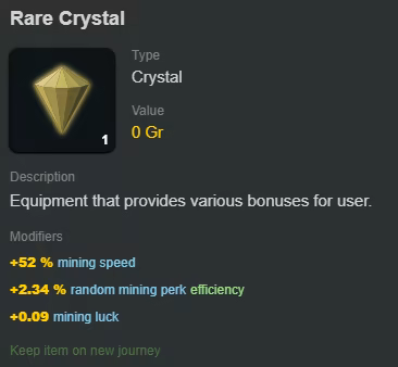Crystals function as the game’s equipment system. They are randomly generated across multiple tiers, providing bonuses and sometimes altering core mechanics. Crystals persist between journeys.