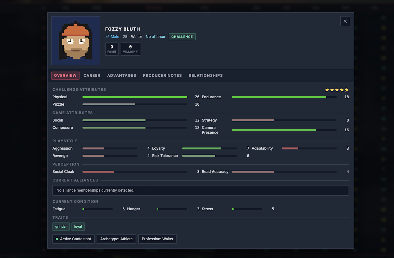 Every season starts with casting. Contestant stats and abilities are masked behind first impressions, audition tapes, and gut feelings. You're making million-dollar bets on people you barely know. That soft-spoken teacher might be a strategic genius. That former athlete might buckle the second the game gets real. Invest more in your casting budget and team to get better reads, or roll the dice and let the chaos sort itself out. As the season progresses, hidden attributes reveal themselves — and you'll find out whether your instincts were right.