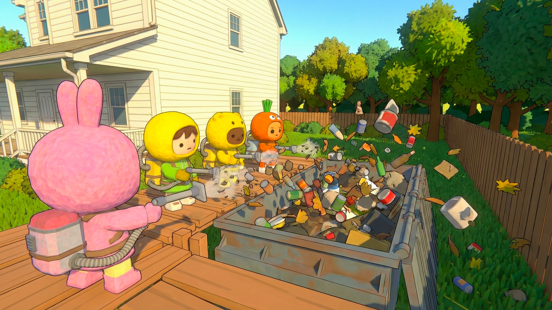 In this chaotic 4-player co-op experience, you and your team are sent into messy homes to declutter them as fast as possible. Use powerful vacuum gear to suck in furniture, trash, appliances — even each other — and throw everything into the dumpster outside before time runs out.