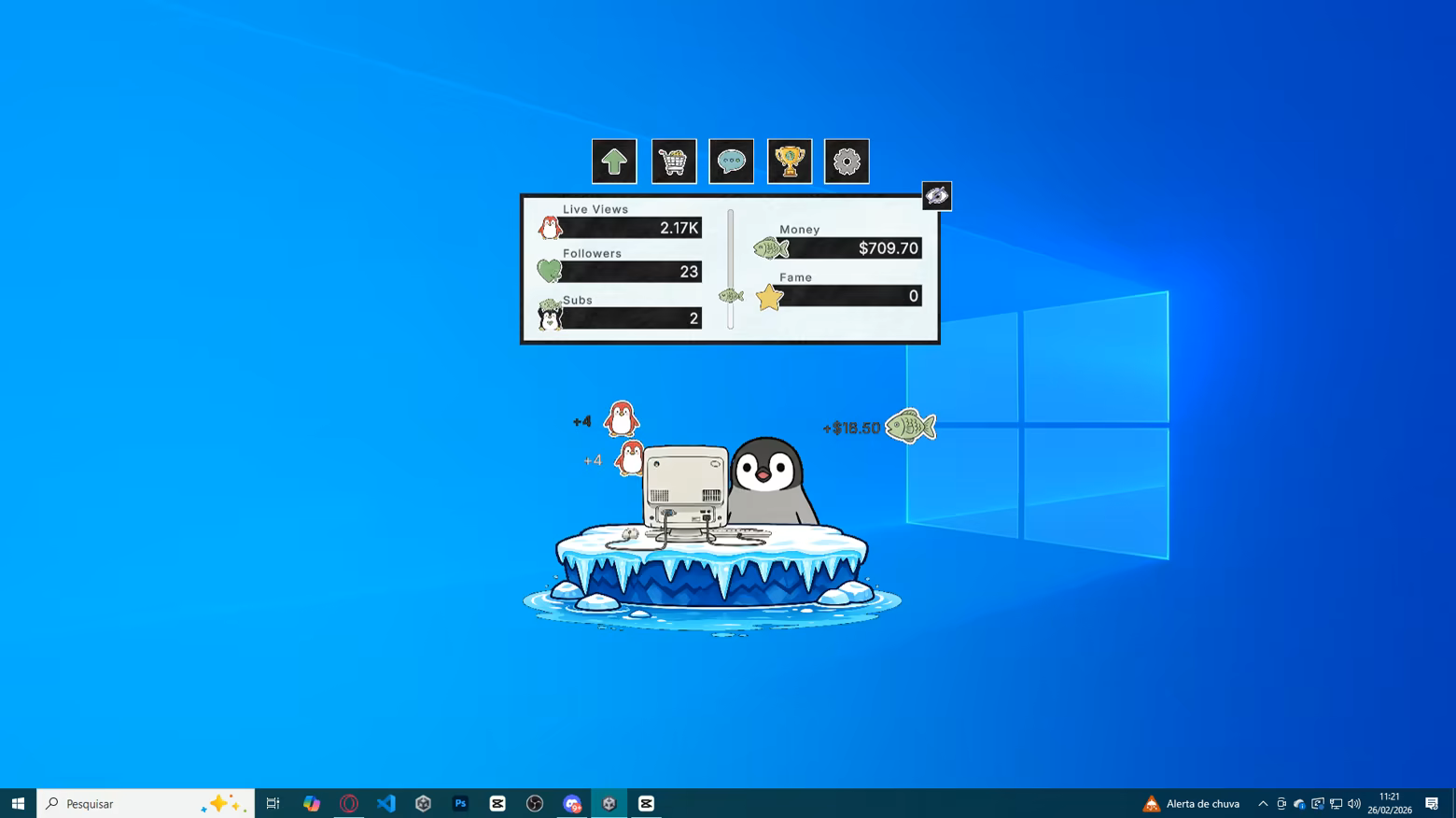 Kinguin is a relaxing idle simulator about a penguin streamer. Leave the game in the corner of your screen while you work, upgrade your setup to turn views into valuable followers and subs, and climb the Global Rank. Dominate the algorithm and become the internet's greatest polar legend!