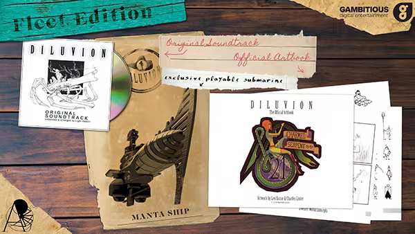 The Special Fleet Edition of Diluvion comes with the game's haunting and beautiful Original Digital Soundtrack (in High-Res FLAC and MP3) composed by Light Return, a Digital version of the Diluvion Official Artbook and an Exclusive playable submarine called Manta