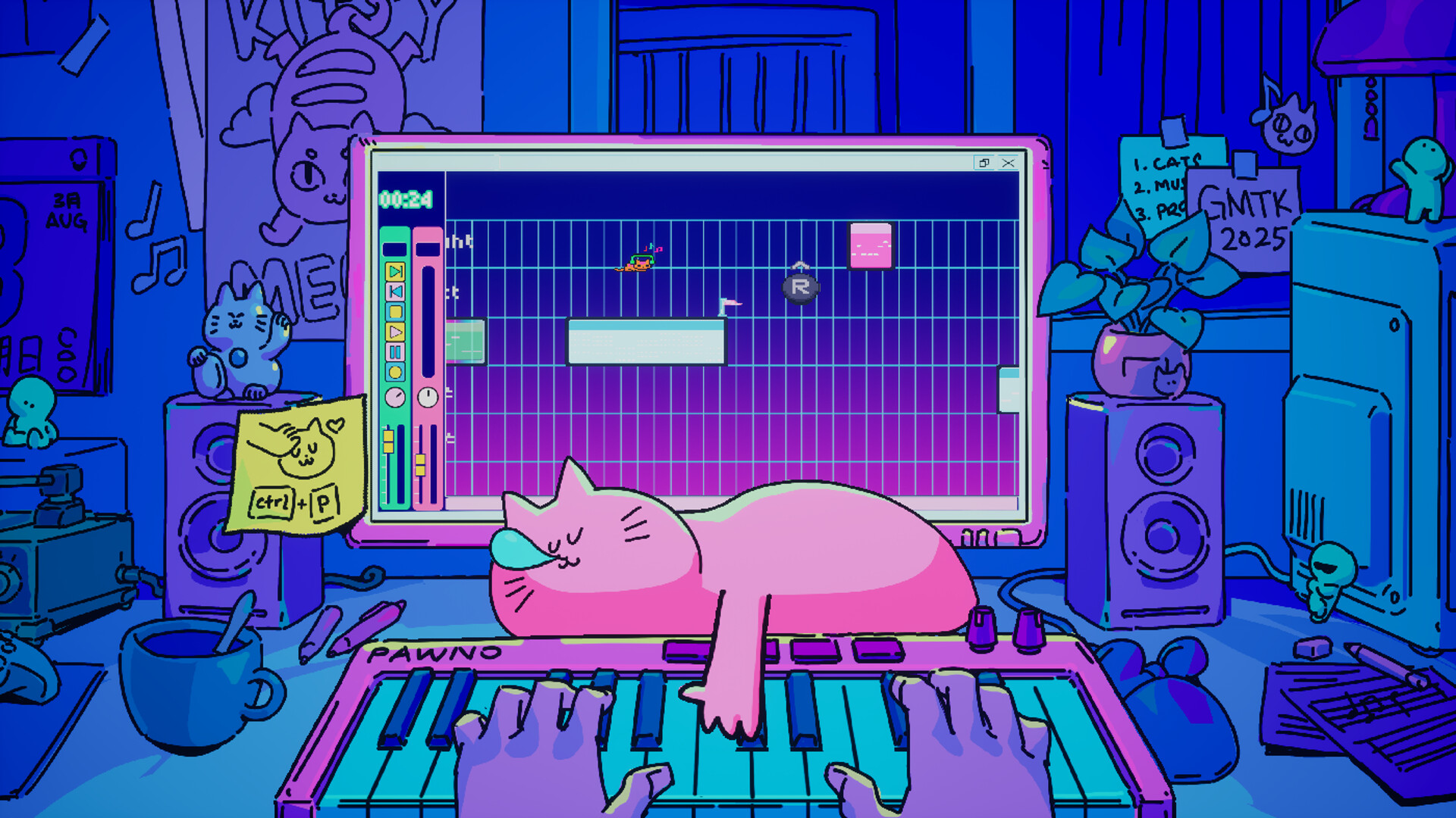 You fell asleep. An orange cat has colonised your DAW soundtrack. Your real cat is mashing your keyboard. Your recycle bin is on fire, and the only way out is to make the music work. This is fine. This is Meowsic. A genre-bending rhythm platformer where the platforms are your audio loops.