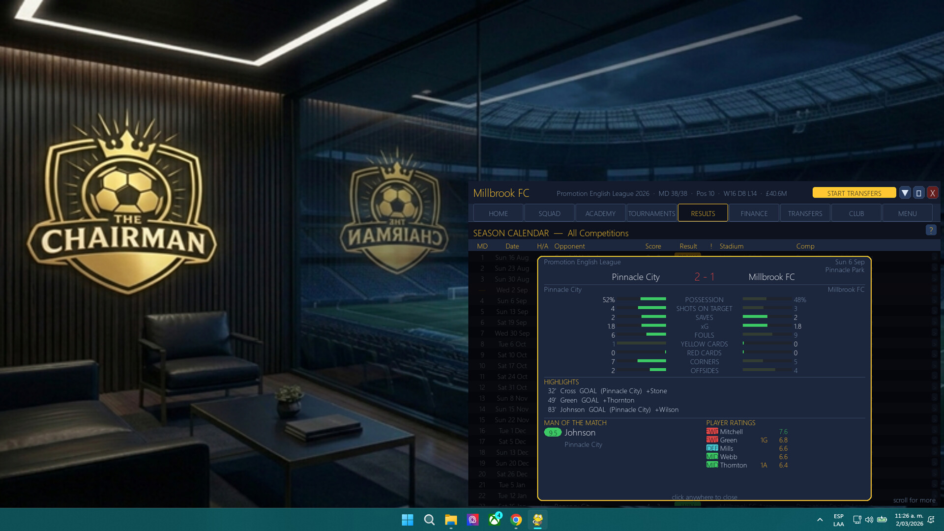 The Chairman is a football management sim built that lives in the bottom corner of your screen. Matches simulate automatically while you work, study, or do anything else. Check in when you have a moment. Make your decisions. Let the season run. You choose the time lap.