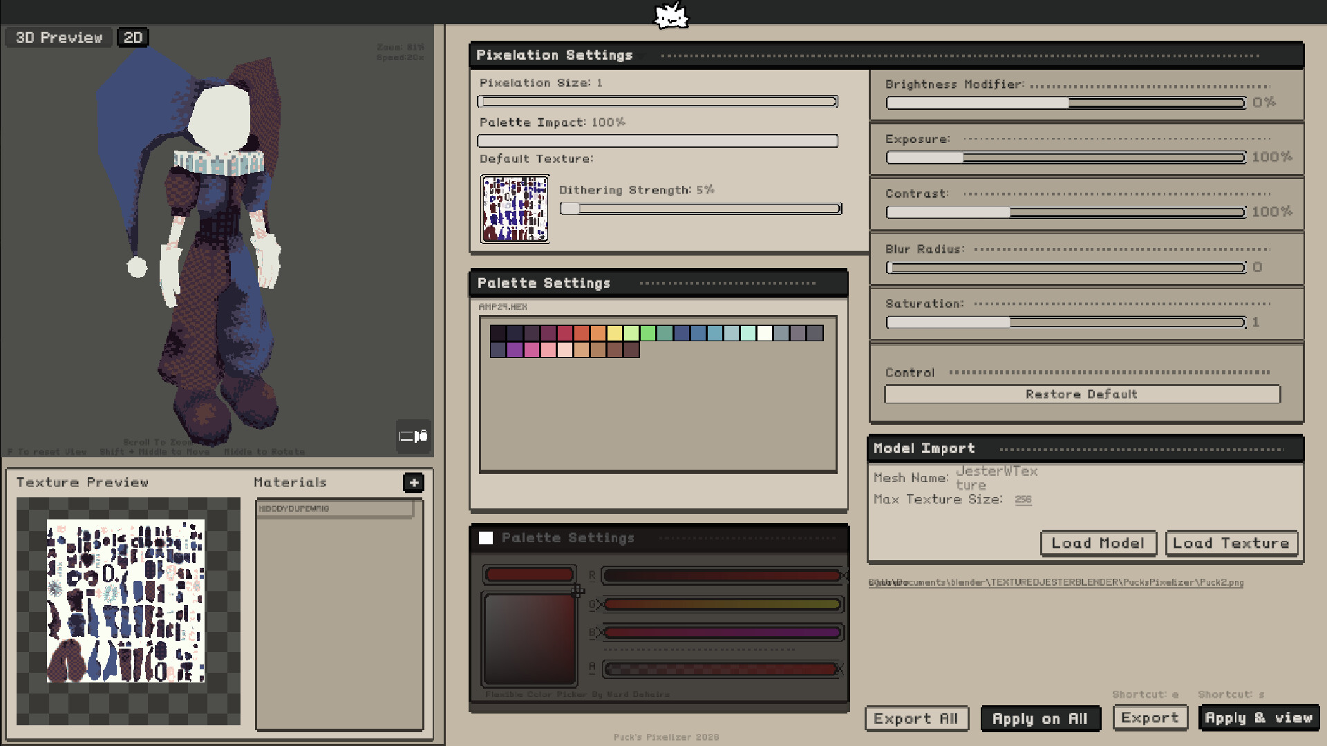 “The final version should be an error free expirience, with an easy theme manager and more customization options. The current version offers you an easy way to pixelize, shade and color modify the textures in single and bulk. You can change the themes using the OS file manager and add custom palettes the same way. The full release will support in program theme and palette changes. The full release will also give it's users an access to further modify their imported models, such as adding a material to it and changing it's position and scale values. ”