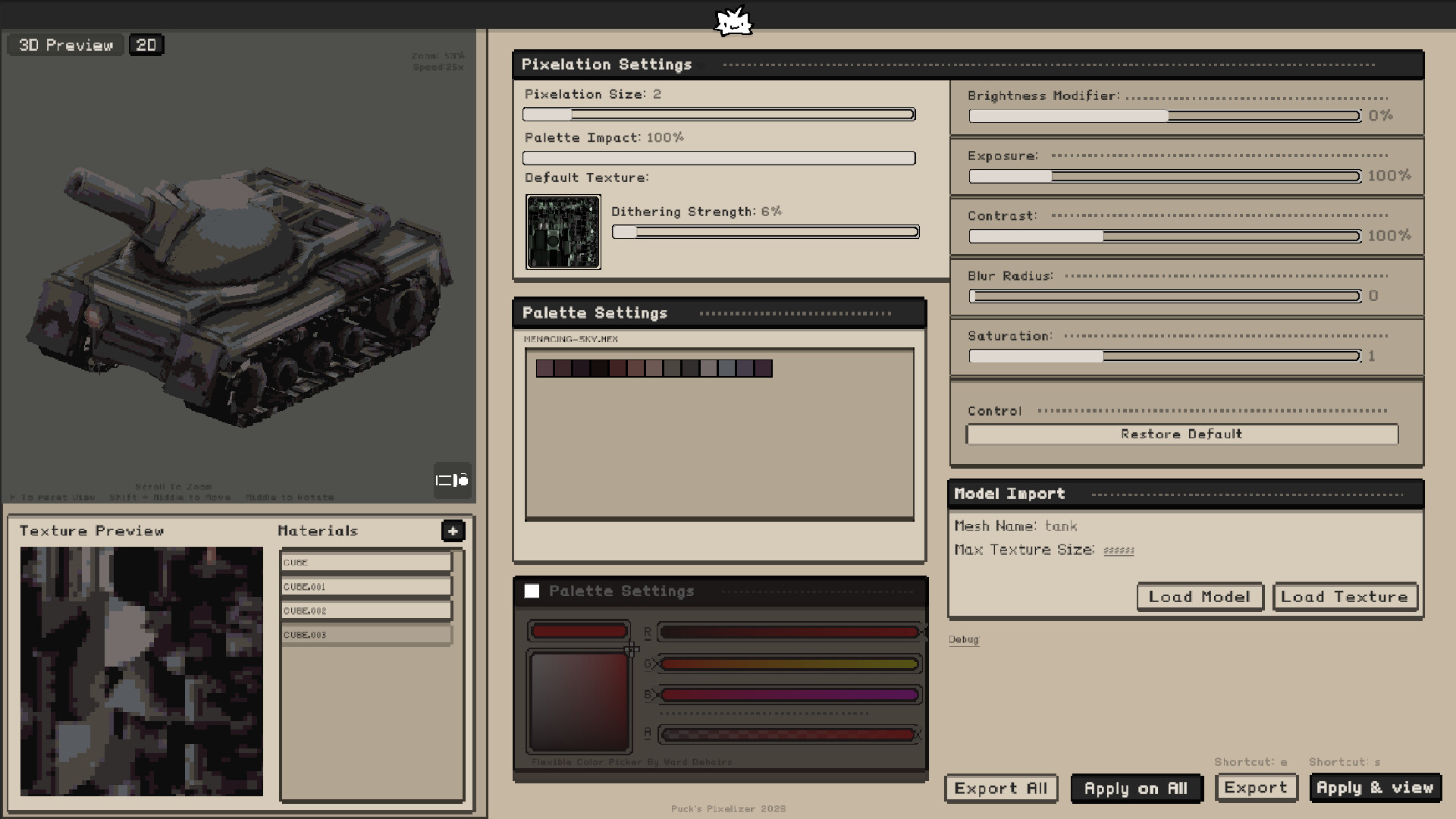“The final version should be an error free expirience, with an easy theme manager and more customization options. The current version offers you an easy way to pixelize, shade and color modify the textures in single and bulk. You can change the themes using the OS file manager and add custom palettes the same way. The full release will support in program theme and palette changes. The full release will also give it's users an access to further modify their imported models, such as adding a material to it and changing it's position and scale values. ”