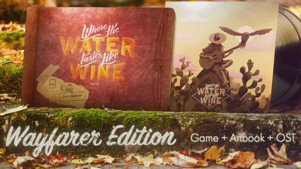 The Special Wayfarer Edition of Where The Water Tastes Like Wine includes its full hauntingly beautiful Original Digital Soundtrack arranged by celebrated composer Ryan Ike (provided as High Quality MP3 and FLAC files), and an Exclusive Illustrated Digital Artbook which chronicles the inspirations behind the game’s unique visual identity.