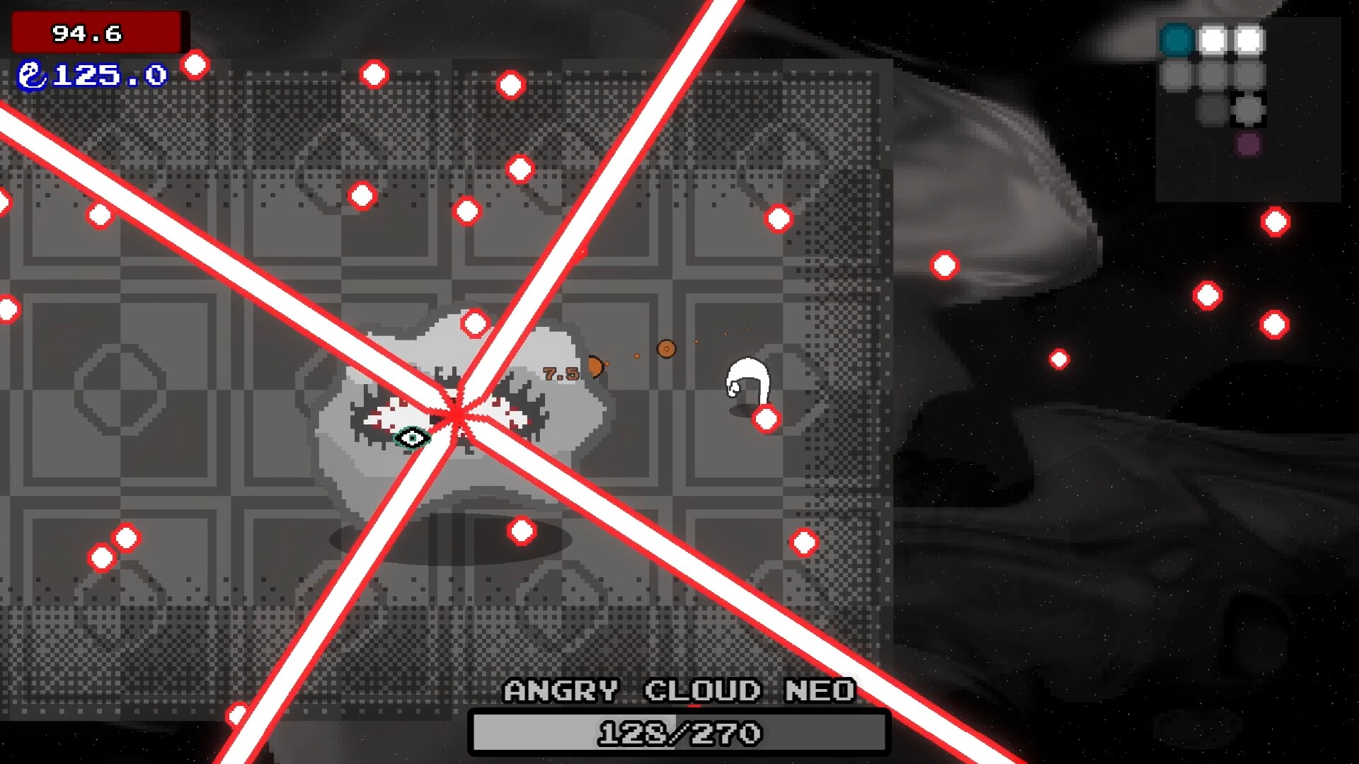 In this game you play as the little fellow we know as CRO, navigate through the void while collecting cool upgrades, synergies and fighting unique bosses along the way. Every room you enter will contain a different boss each with their own bullet hell patterns.