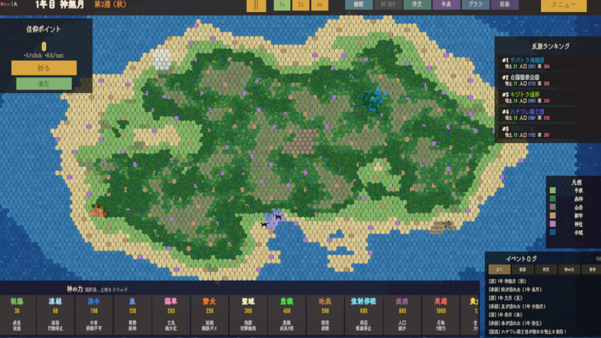 There are many kinds of divine powers available, including supportive abilities such as Blessing and Hero Summon, as well as destructive ones like Storm, Earthquake, Plague, and Meteor. You can also unleash chaos upon the world through powers such as Forced Truce, Betrayal that destroys alliances, and Revolution that causes territorial uprisings.