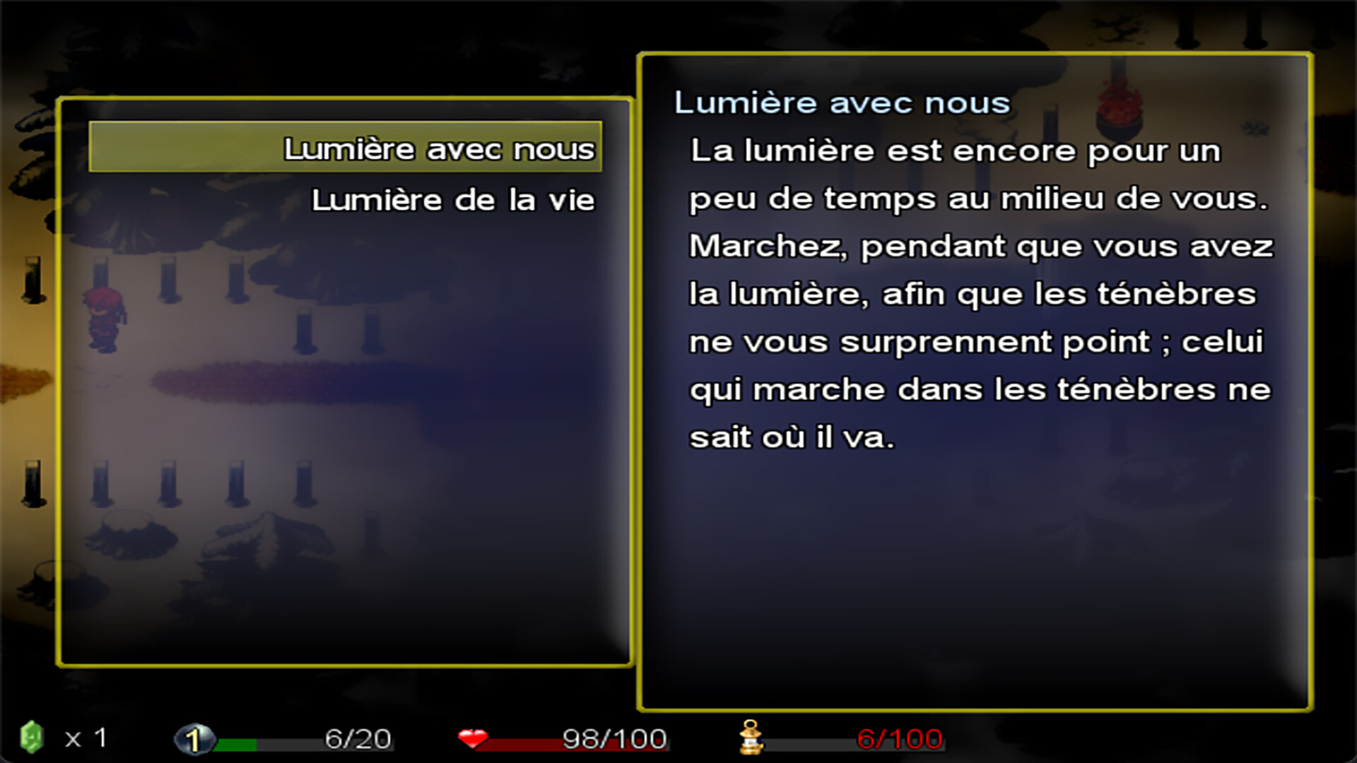Armé(e) seulement d’une épée, d’un arc et d’une lampe fragile alimentée par des paroles sacrées, votre survie dépendra de votre foi, de votre sens de l’exploration et d’une gestion prudente de vos ressources.