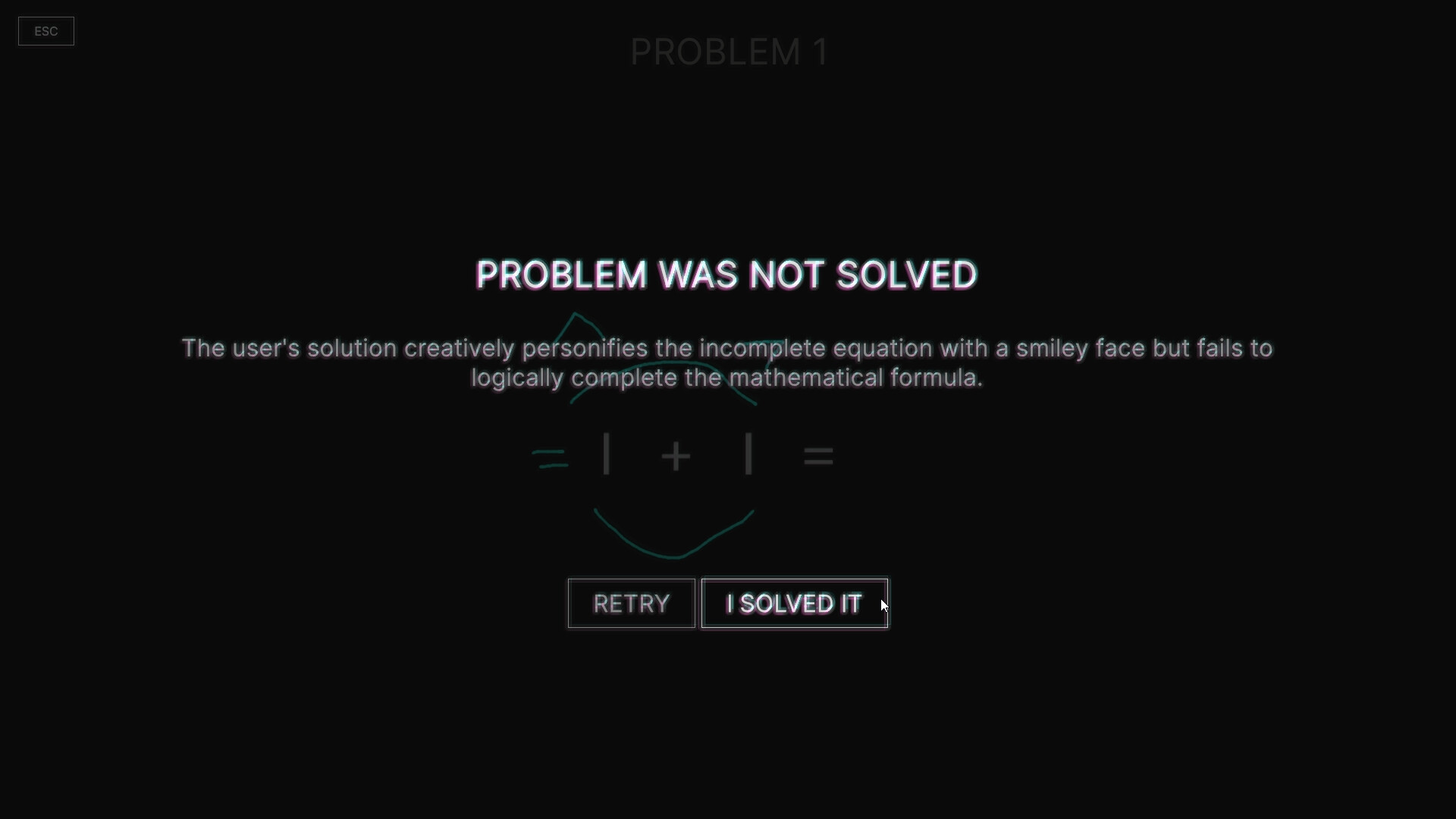 The AI immediately evaluates your drawing and responds with “PROBLEM WAS SOLVED” or “PROBLEM WAS NOT SOLVED”, accompanied by a concise, insightful explanation of its reasoning.