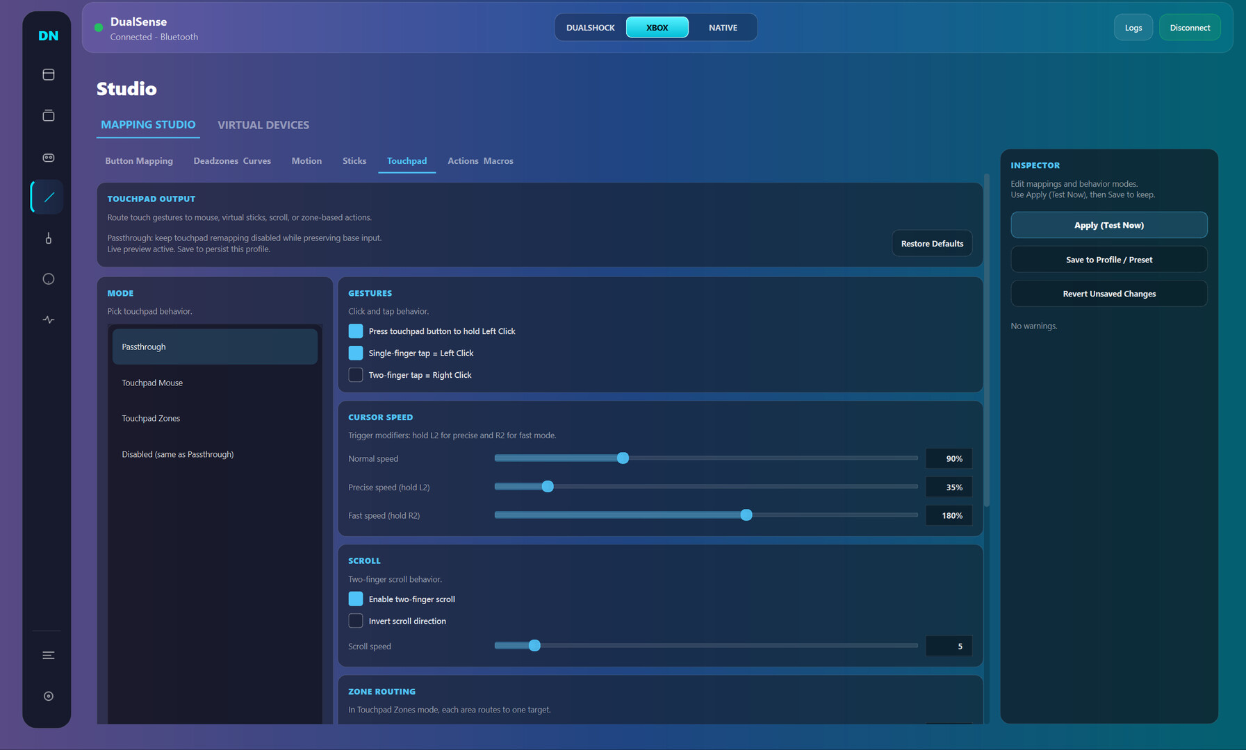 “Current version is usable for daily controller customization, with full DualSense support and partial DualSense Edge support. Available features include mode switching (Native, Xbox, DualShock-compatible workflows), profile management, mapping studio, trigger/haptic/lighting tuning, live input monitoring, and logs/diagnostics. Current limitations include incomplete Edge parity, limited non-Sony controller support, and ongoing UX/performance polish.”