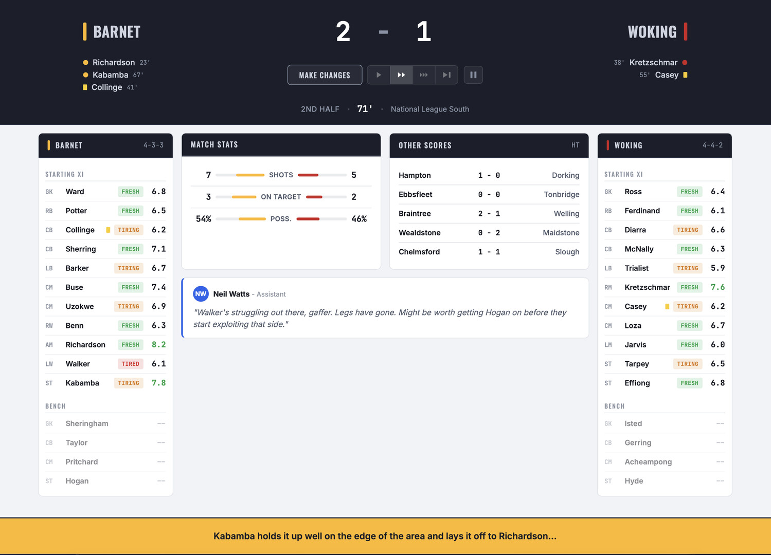 Every match runs through a purpose-built match engine with live move-by-move commentary. You watch it unfold in real time — reading the game, making substitutions, changing shape, adjusting the mentality when you're hanging on with ten minutes left. Derby matches feel like derbies. The crowd is different, the intensity is different, and the players respond to it. The engine was designed for non-league football, and it plays like it.