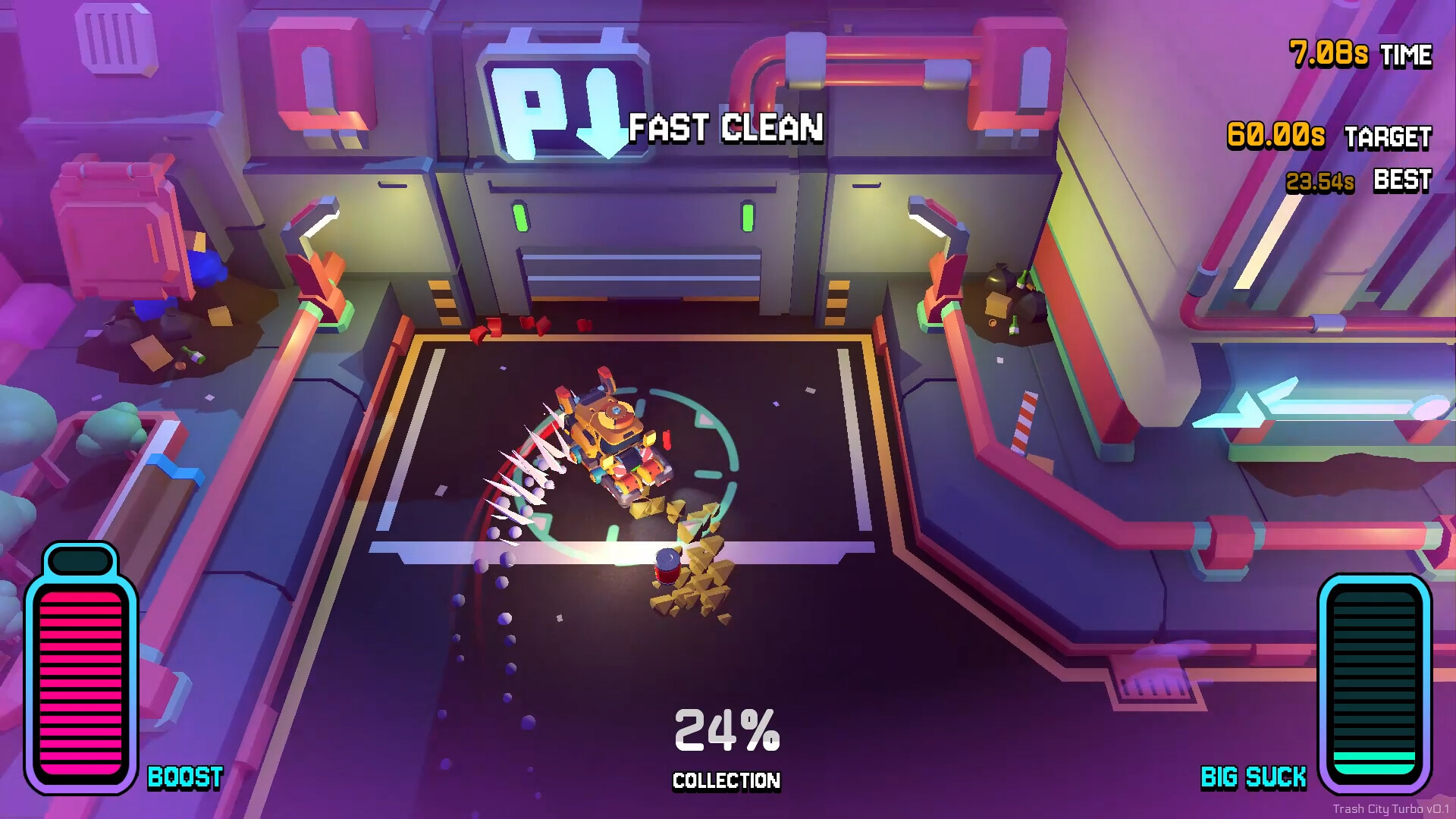 Trash City Turbo is about cleaning each filthy little district of Neotropolis, as fast as you can. It’s immediate fun and satisfaction with minimal friction, all wrapped in a gorgeous Cyber-Chunk art style. Explore the single-player campaign as you fight to protect your honest living from a ruthless mega corp intent on pushing their automated, robotic tech into all sectors of municipal work. Revisit locations and challenges to score the perfect run on each job.