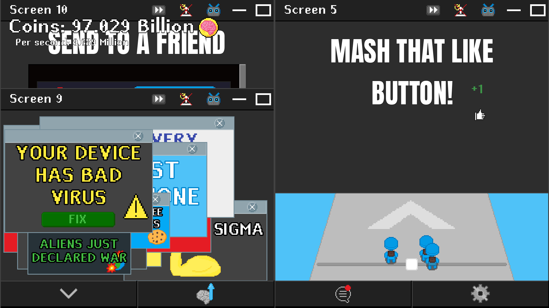 Buy more screens, an autoscroller, and a minigame autosolver to fully automate your income. Watch the numbers rise even when AFK.