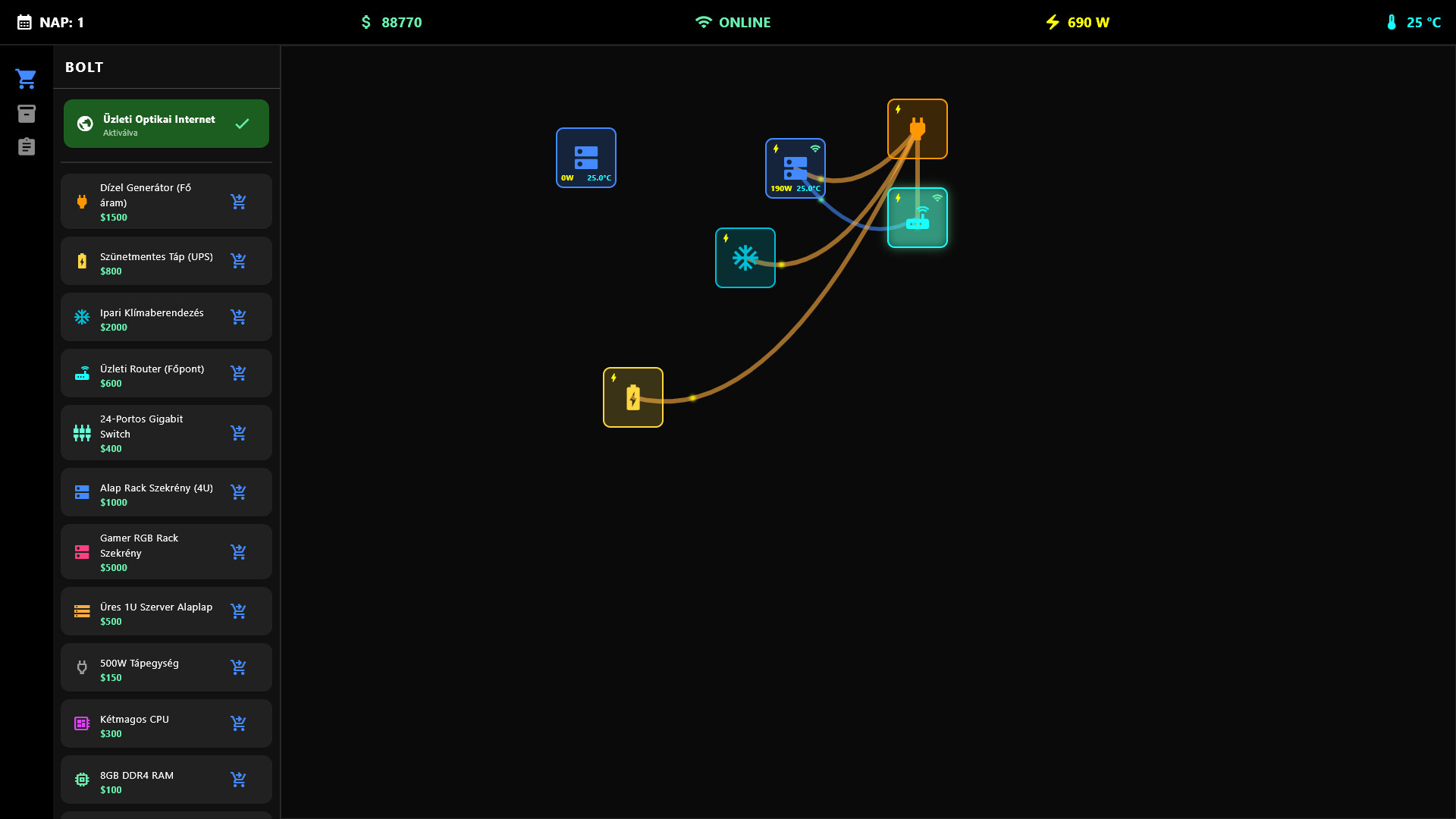 • Graph-Based Cabling Simulation: Connect your devices with realistic network (CAT6) and power cables. Watch the animated data flow and ensure every machine receives both power and internet.