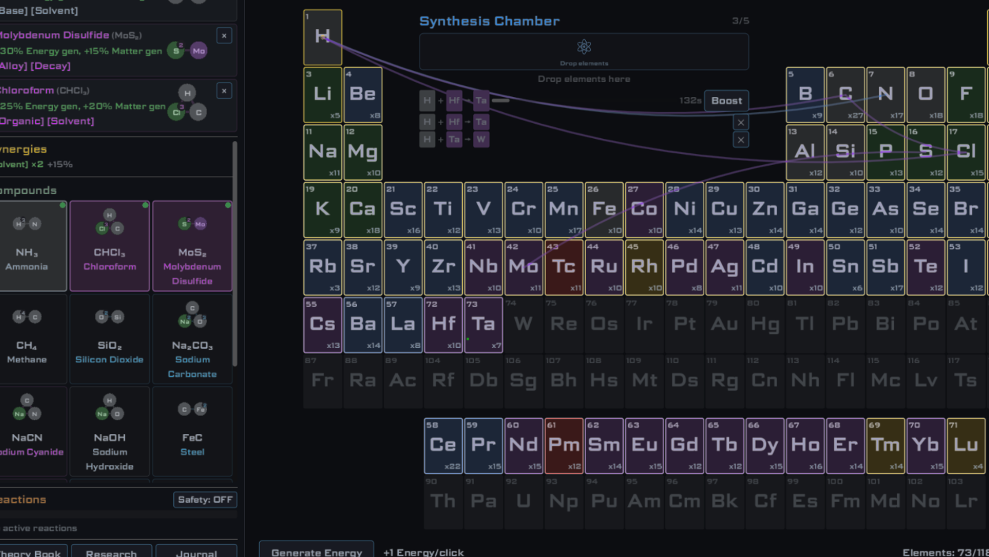 Build your atomic empire. Fuse elements, craft real compounds, trigger chain reactions, and break the periodic table wide open in an idle game where chemistry IS the strategy.