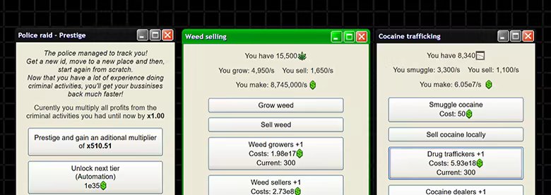 Earn money through criminal activities like hacking people and running illicit operations. Reinvest your profits to upgrade everything, automate, and scale your operation into a powerful criminal syndicate.
