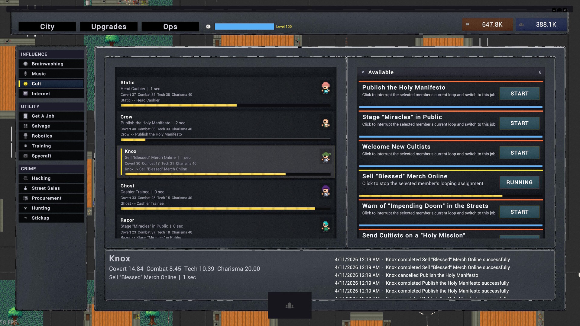 Manage your own squad of followers to overthrow a dystopian megacorporation that secretly runs the world! Build up your crew, money, influence, and resources to resist the ever-growing threats.