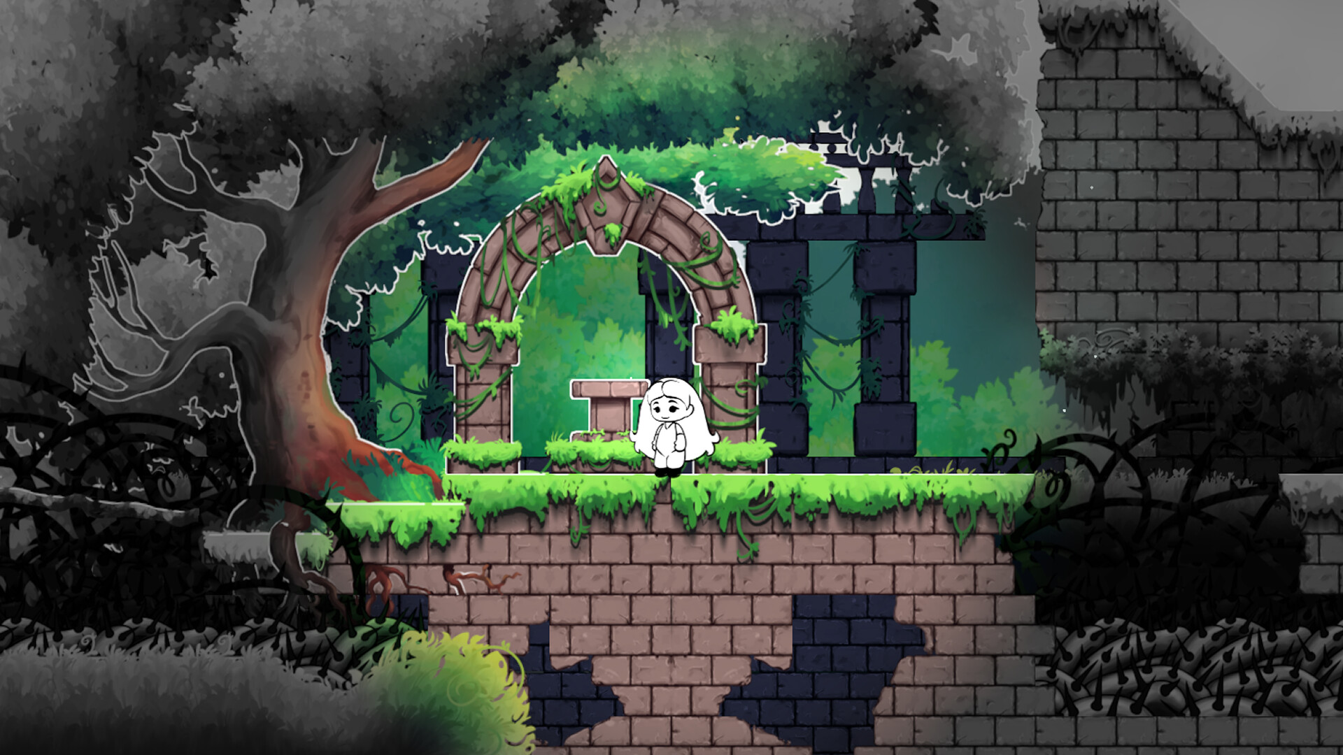 When you begin, the world is completely black and white and there is no music whatsoever. Everything except for you is frozen in time. As soon as you find your first musical instrument you can play it to bring a small pocket of the world back to life. Use your instrument to make platforms move, enemies move, and open up new traversal options.