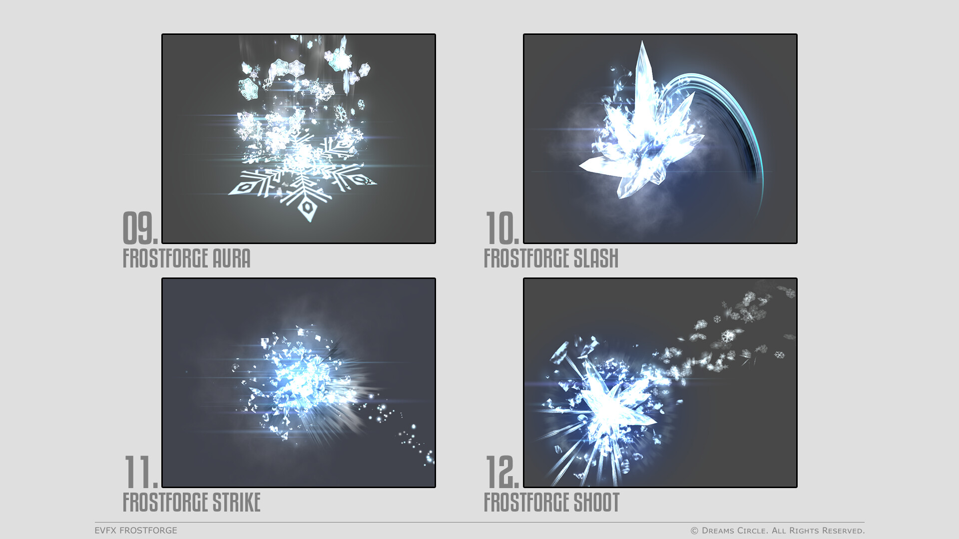 Designed by Dreams Circle, a team specializing in high-quality game assets, "EVFX Frostforge" features 16 gorgeous visual effects AND complementary sound effects, allowing you to add that professional polish to your projects easier than ever before and awe your audience!
