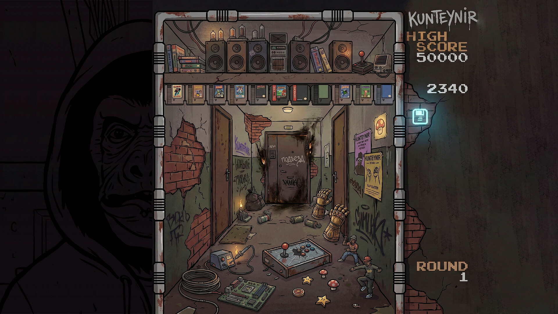 KUNTEYNIR - is an Arkanoid with character. The setting is the Russian outback, with its courtyards, garages, and entryways, where underground hip-hop was born. Instead of outer space, there are residential areas, instead of fantasy, there's harsh reality, and instead of abstract blocks, there are fragments of the urban environment.