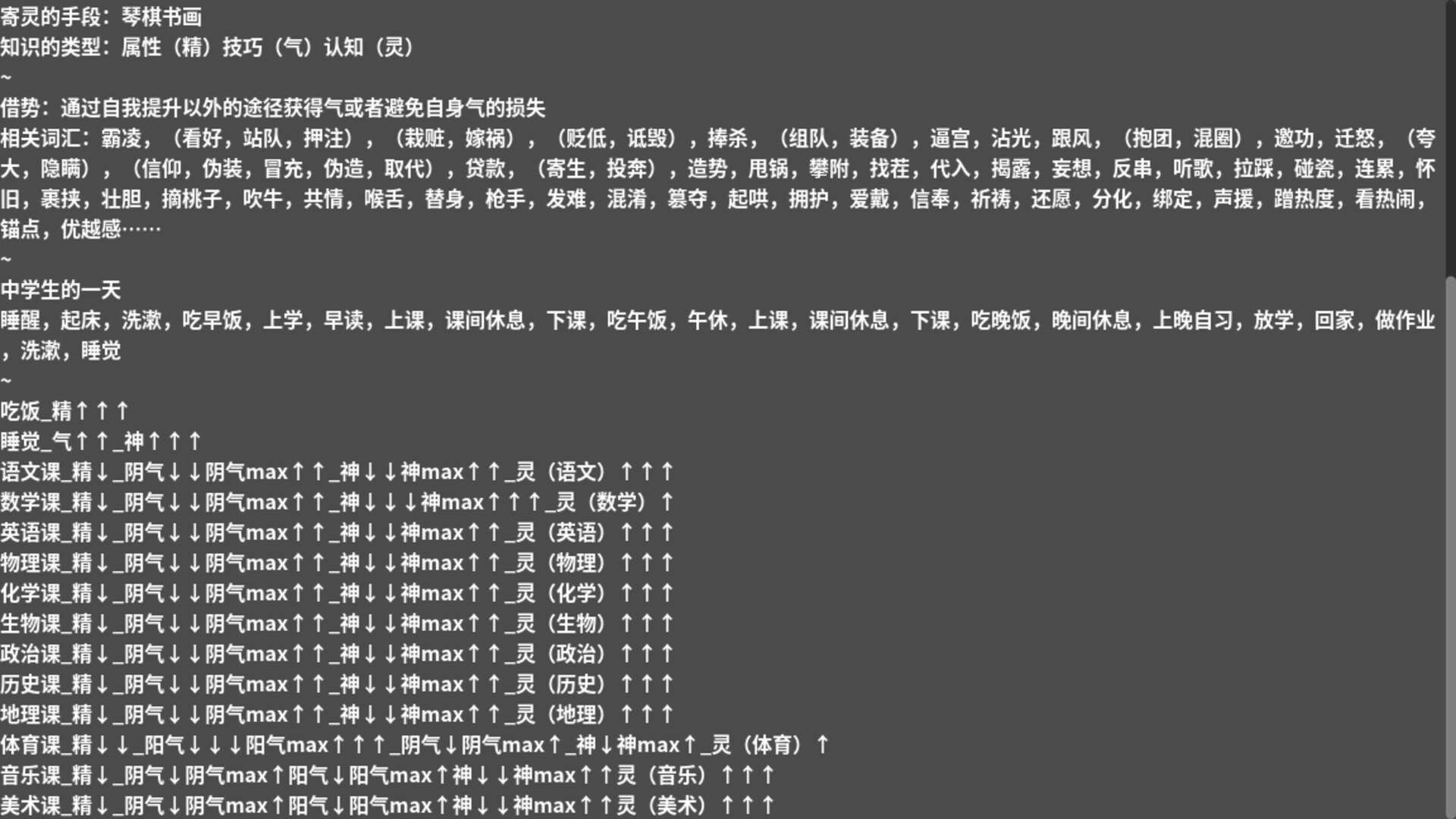 软件内容为纯文字,包含精气神灵的基础概念,延伸概念,与“气”相关的重要概念“借势”的解释及相关词汇,以及中学生的日常从精气神灵角度的分析