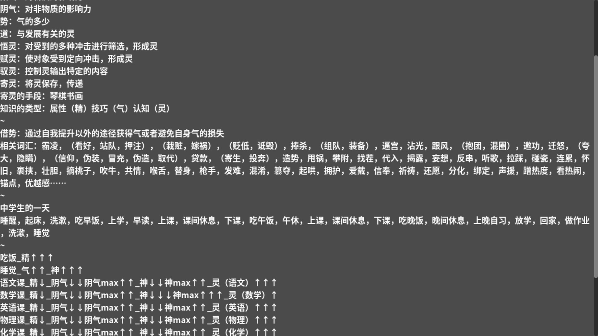 软件内容为纯文字,包含精气神灵的基础概念,延伸概念,与“气”相关的重要概念“借势”的解释及相关词汇,以及中学生的日常从精气神灵角度的分析