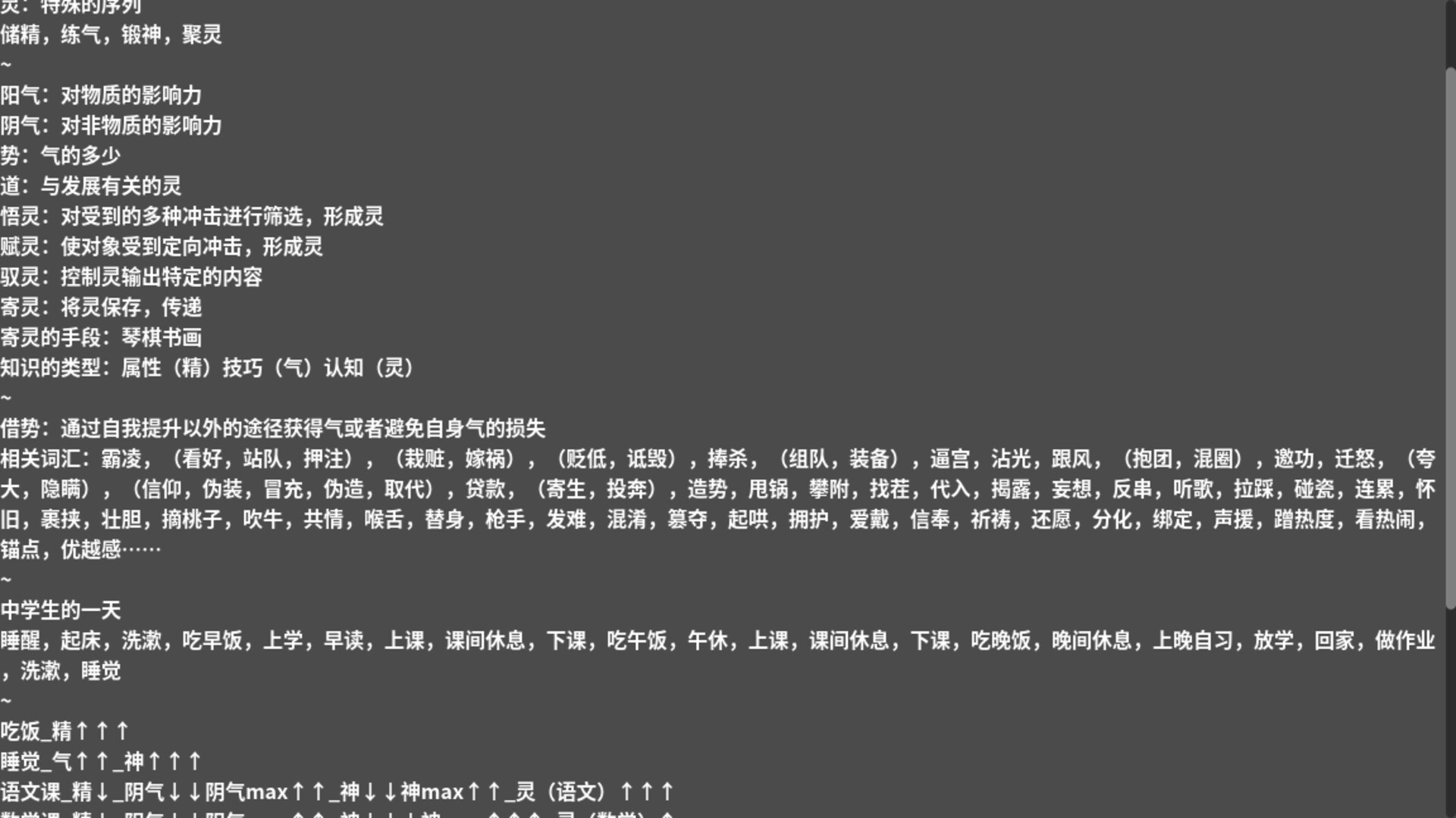 软件内容为纯文字,包含精气神灵的基础概念,延伸概念,与“气”相关的重要概念“借势”的解释及相关词汇,以及中学生的日常从精气神灵角度的分析